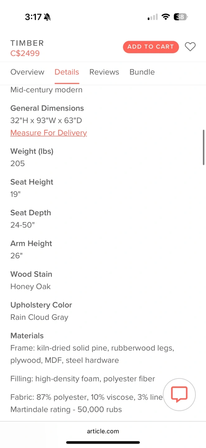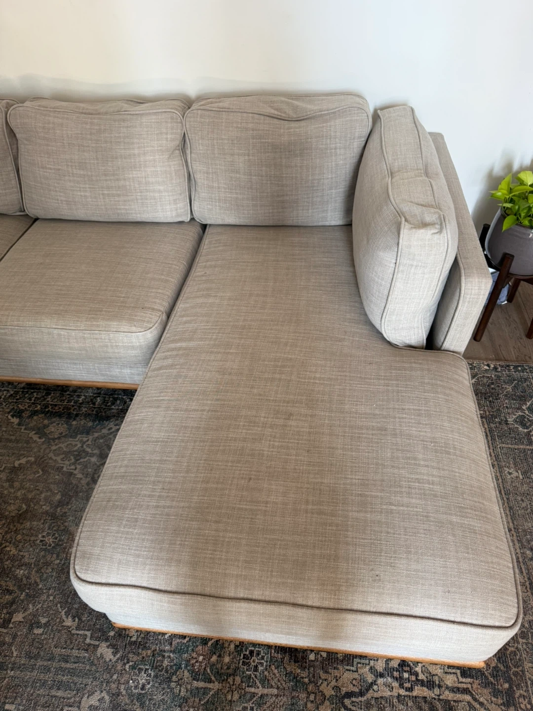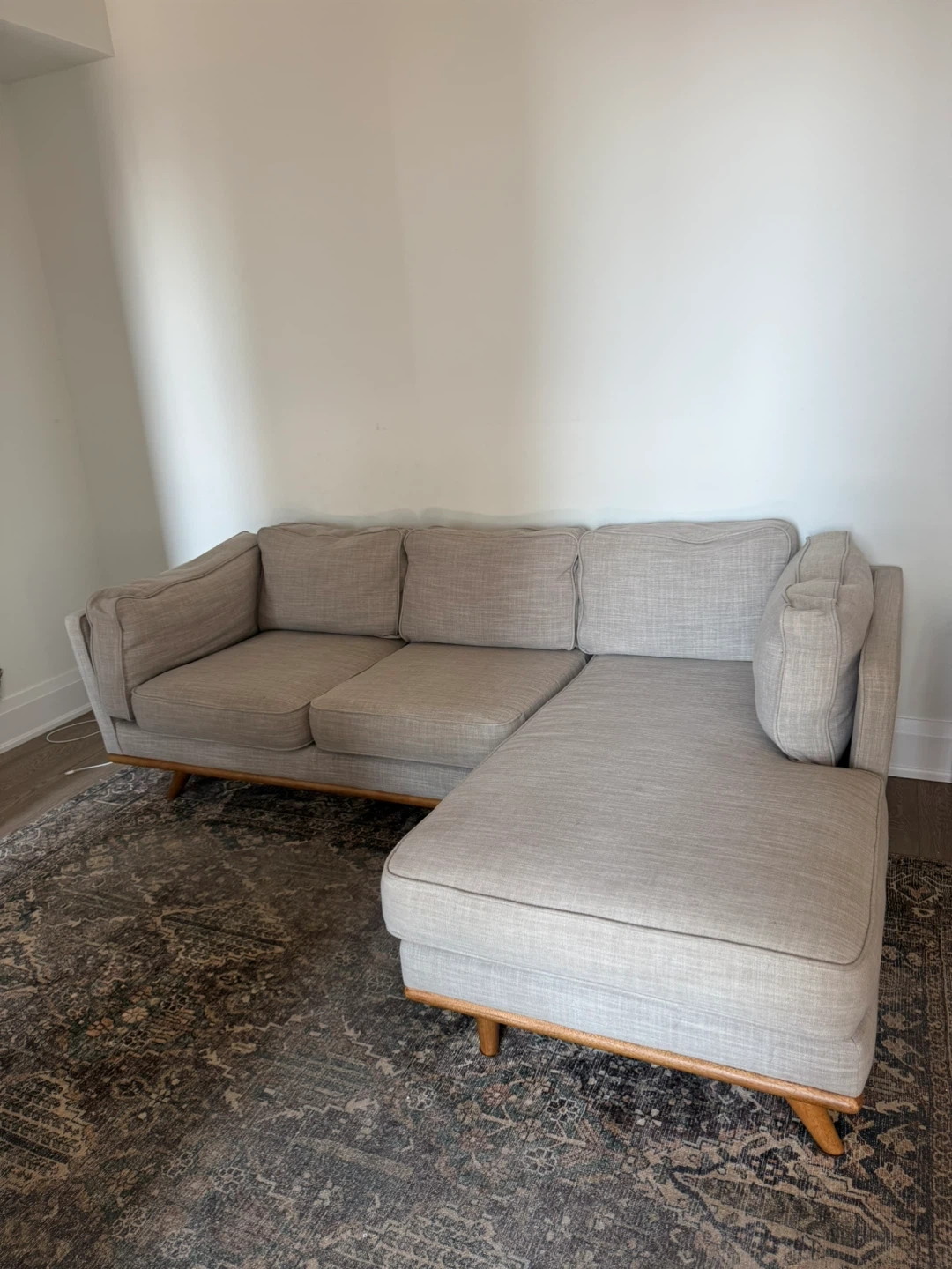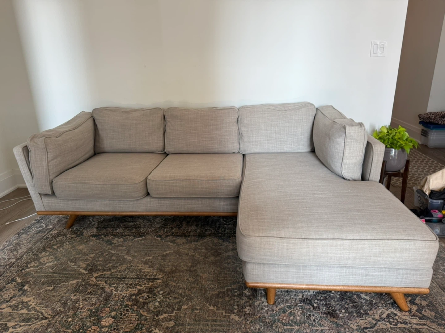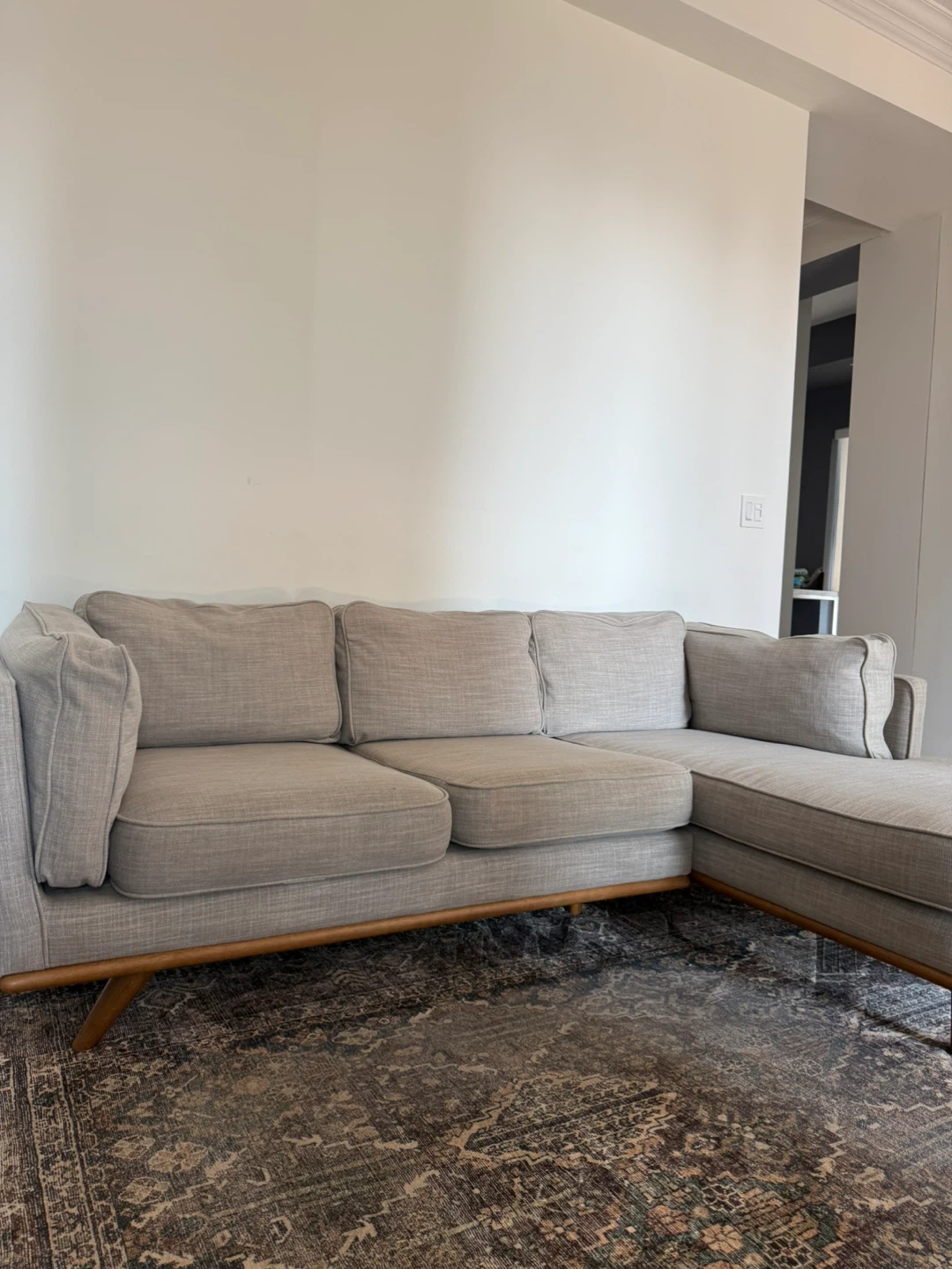 Article Timber 93" Right Sectional - Rain Cloud Gray with honey oak stain trim and voluptuous linen-blend cushions