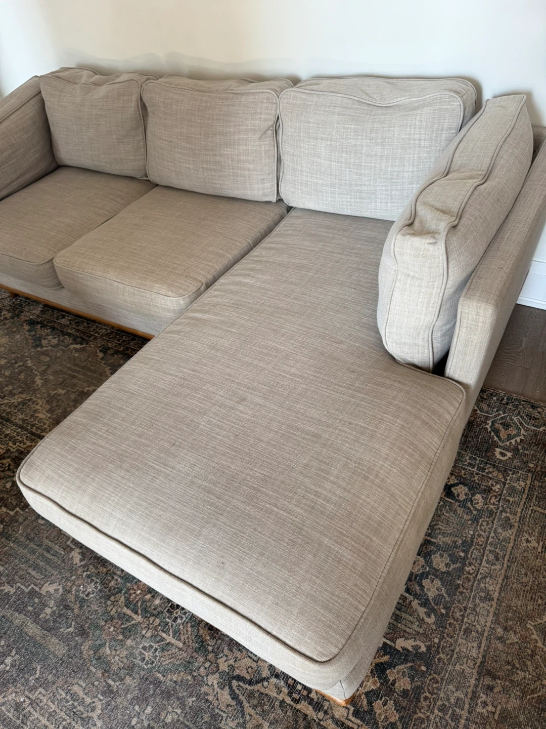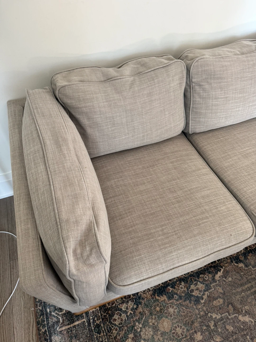 The couch comes apart in two pieces for easy moving. The armrests and back pillows have removable covers that can be tossed in the washing machine.