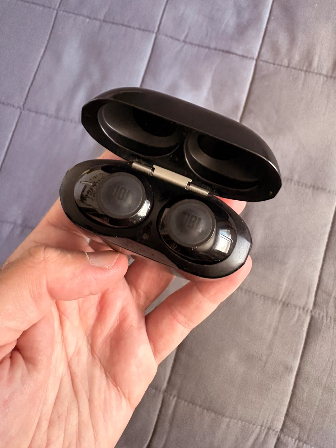 Selling a pair of JBL wireless in-ear headphones in black. They are in great condition and come with their charging case. Used in good condition.