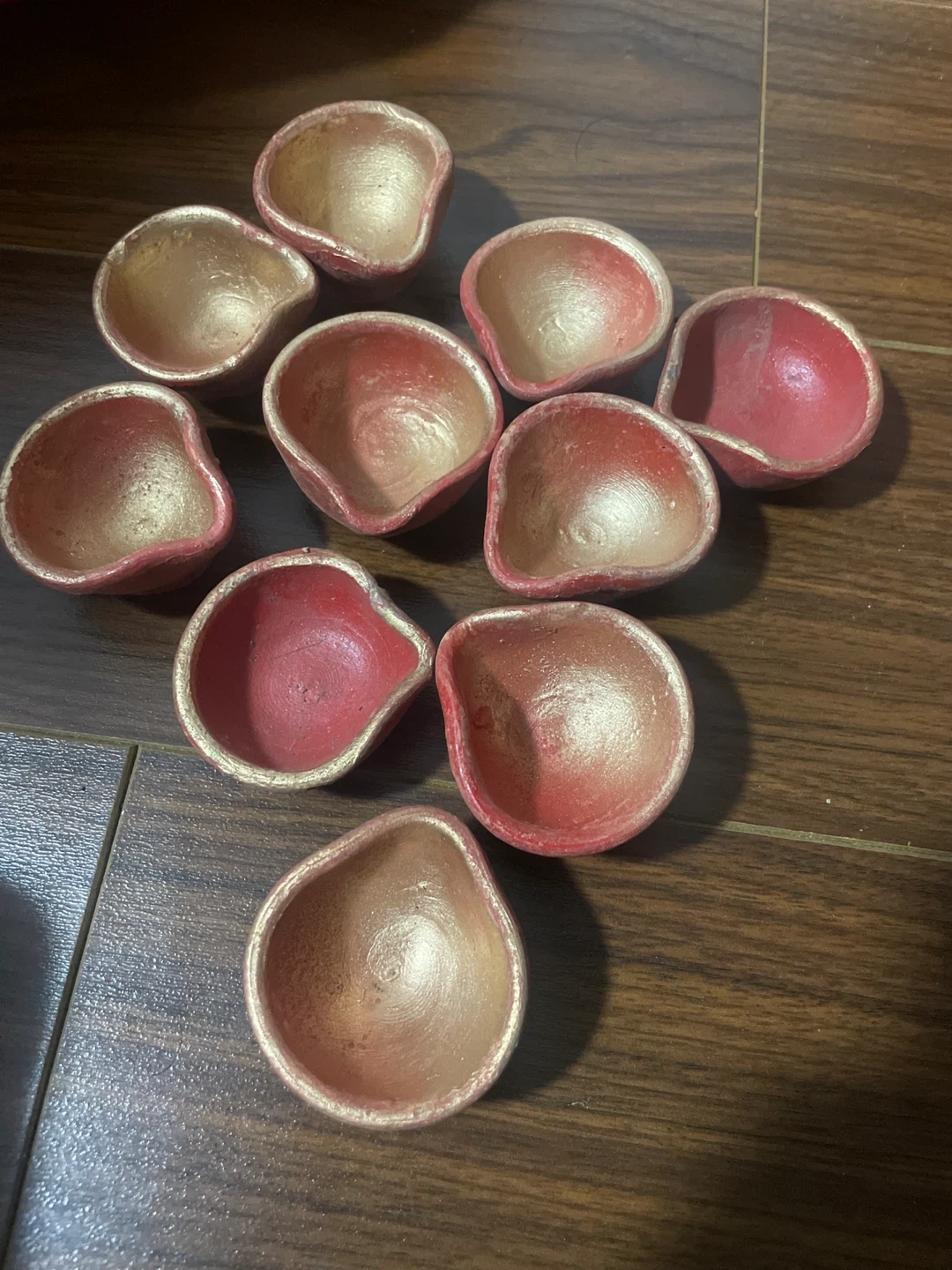 Selling a set of four traditional Diya clay oil lamps! These are perfect for adding a warm and festive touch to your home. They're in great condition and ready to use