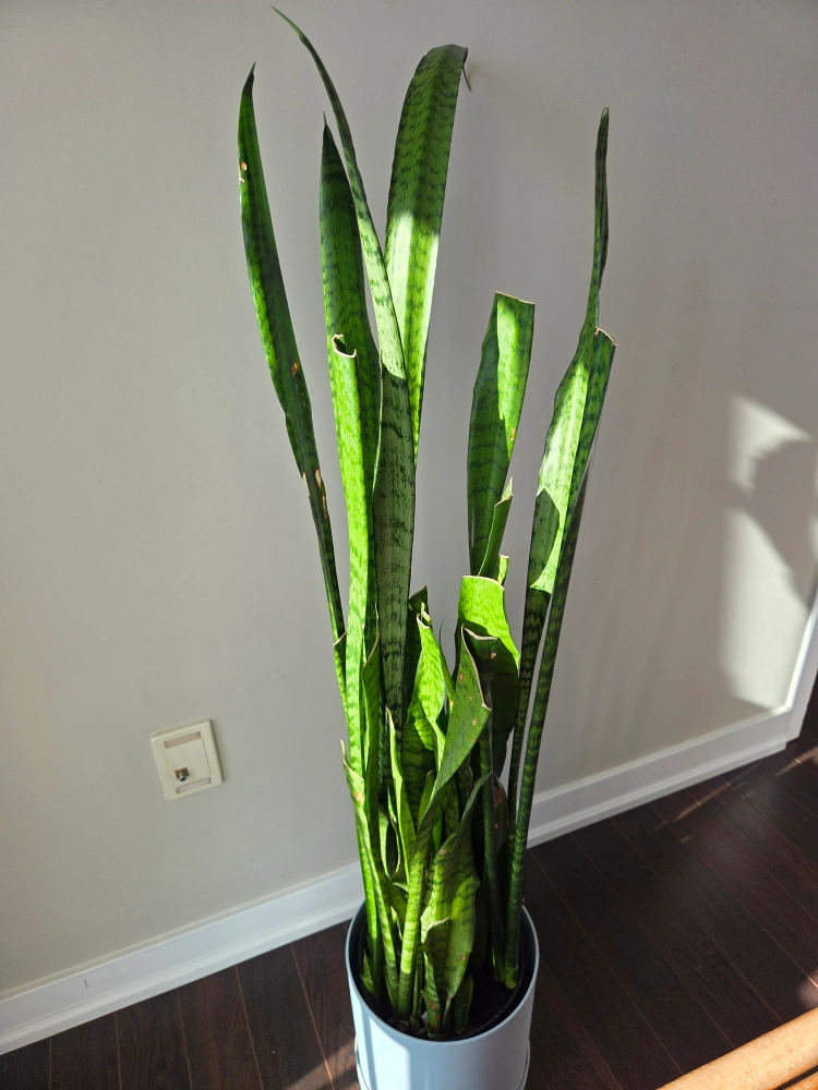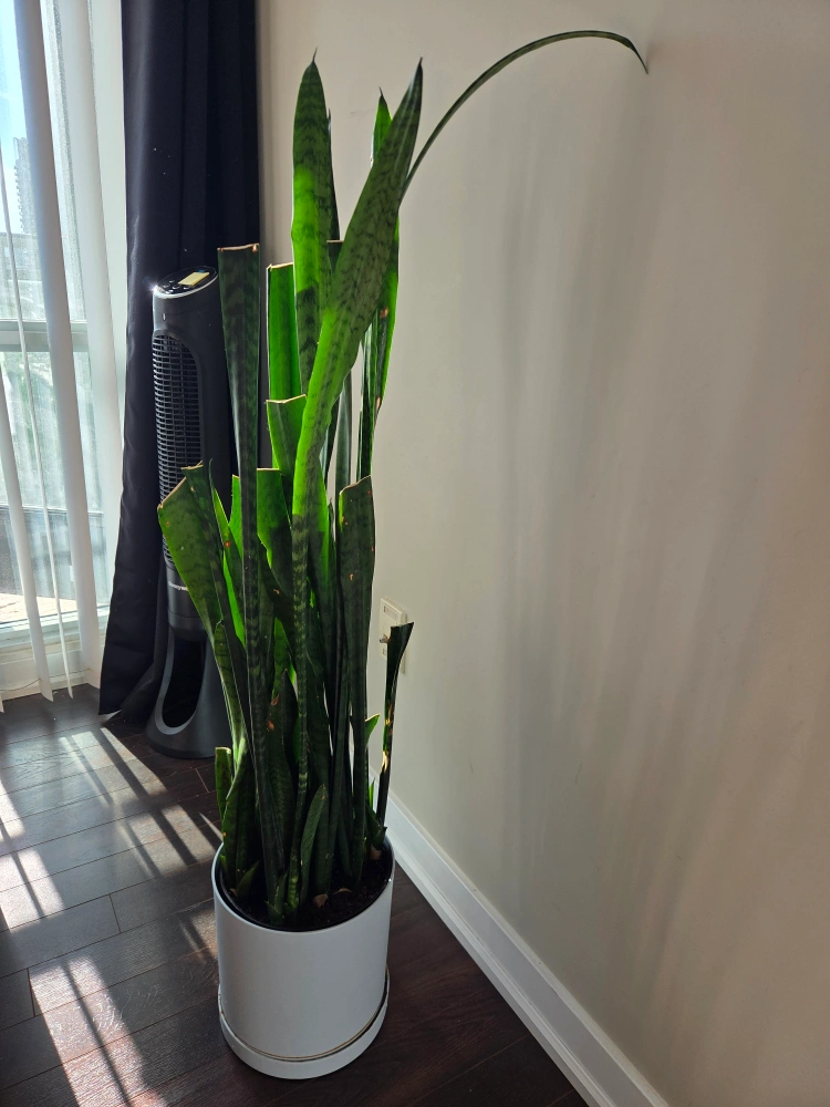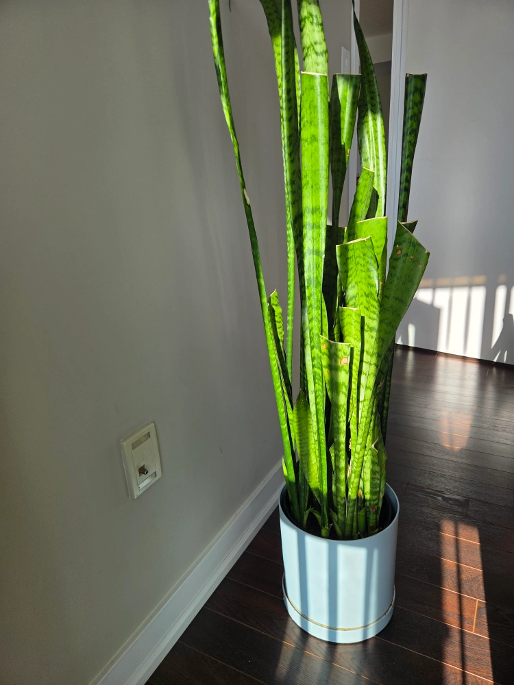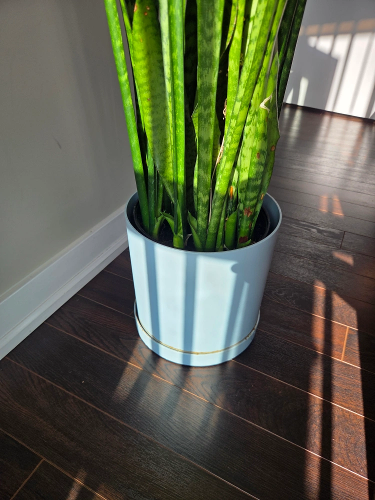 Selling a healthy snake plant in a light blue planter! It's a great way to add some greenery to your space and is super easy to care for.