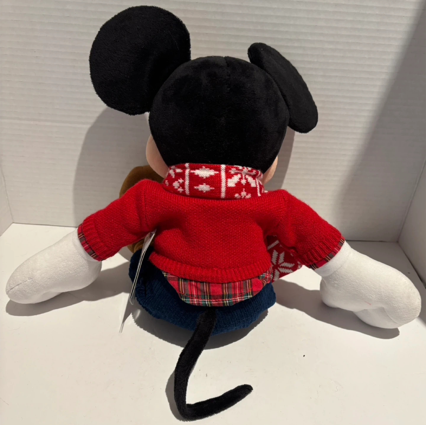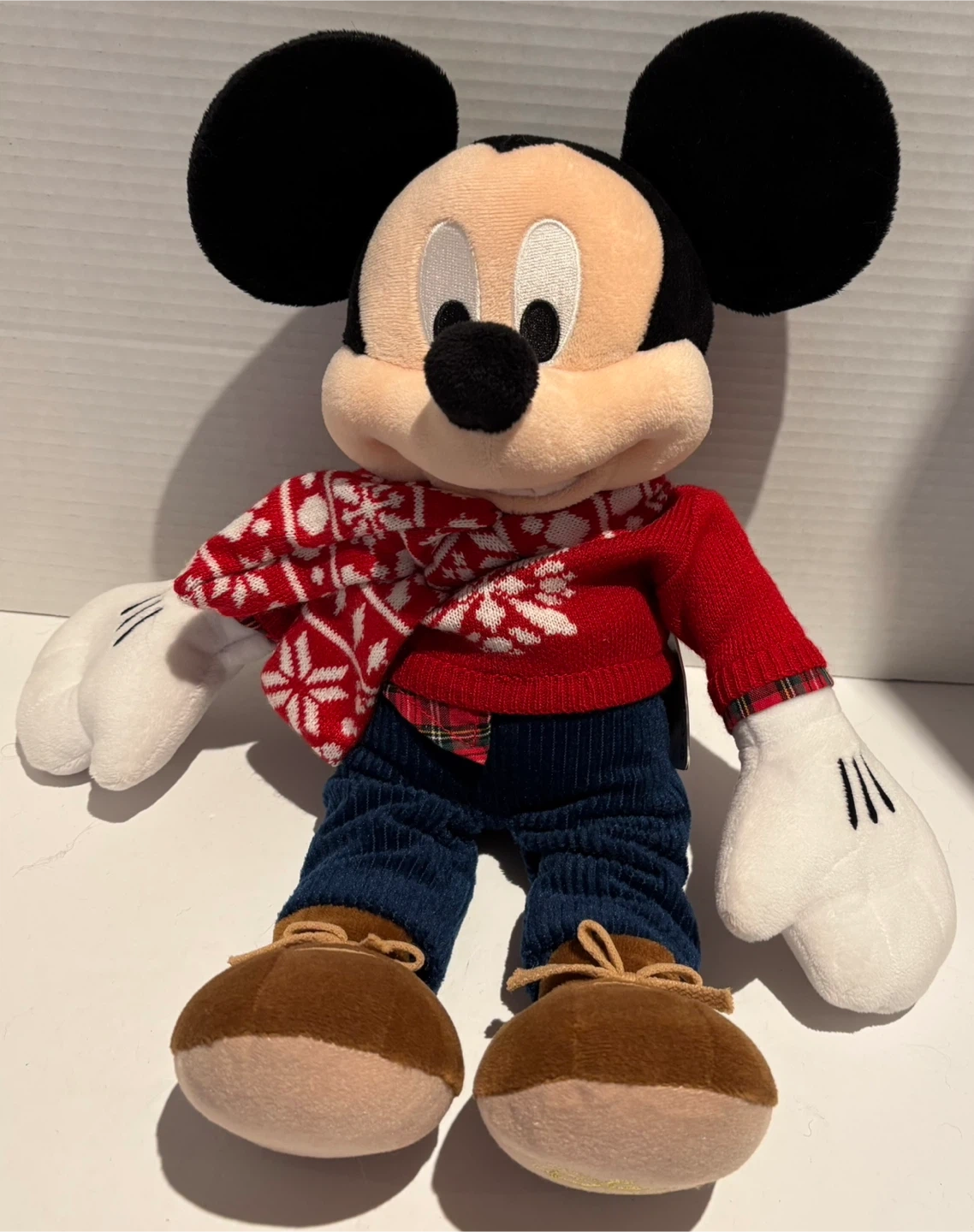 Selling a cute Mickey Mouse plush from the Disney Store! He's wearing a festive red sweater, scarf, and plaid shirt. The Disney Store logo is embroidered on his foot with the year 2015. A perfect holiday decoration or gift for a Disney fan!