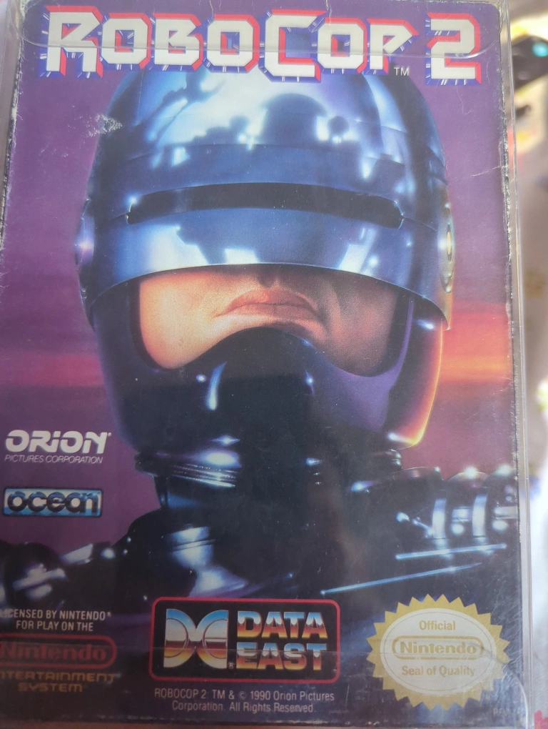 Selling a used RoboCop 2 Nintendo game. It's licensed by Nintendo and published by Orion Pictures Corporation. Data East developed this game in 1990. It is in good condition for its age