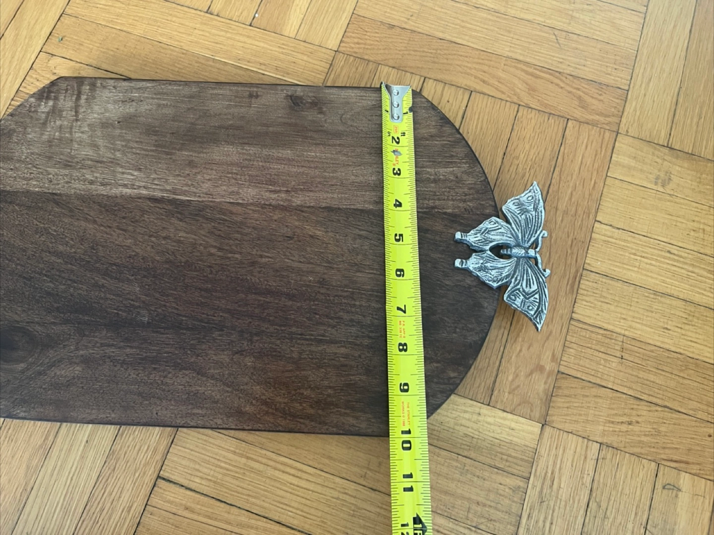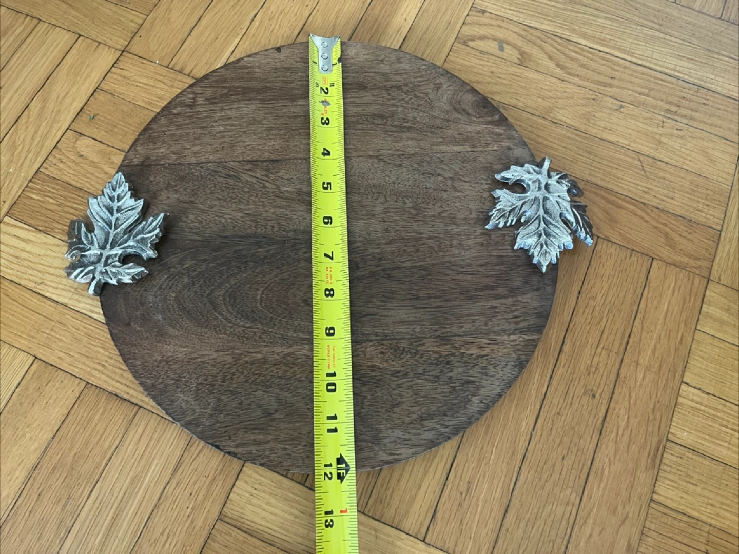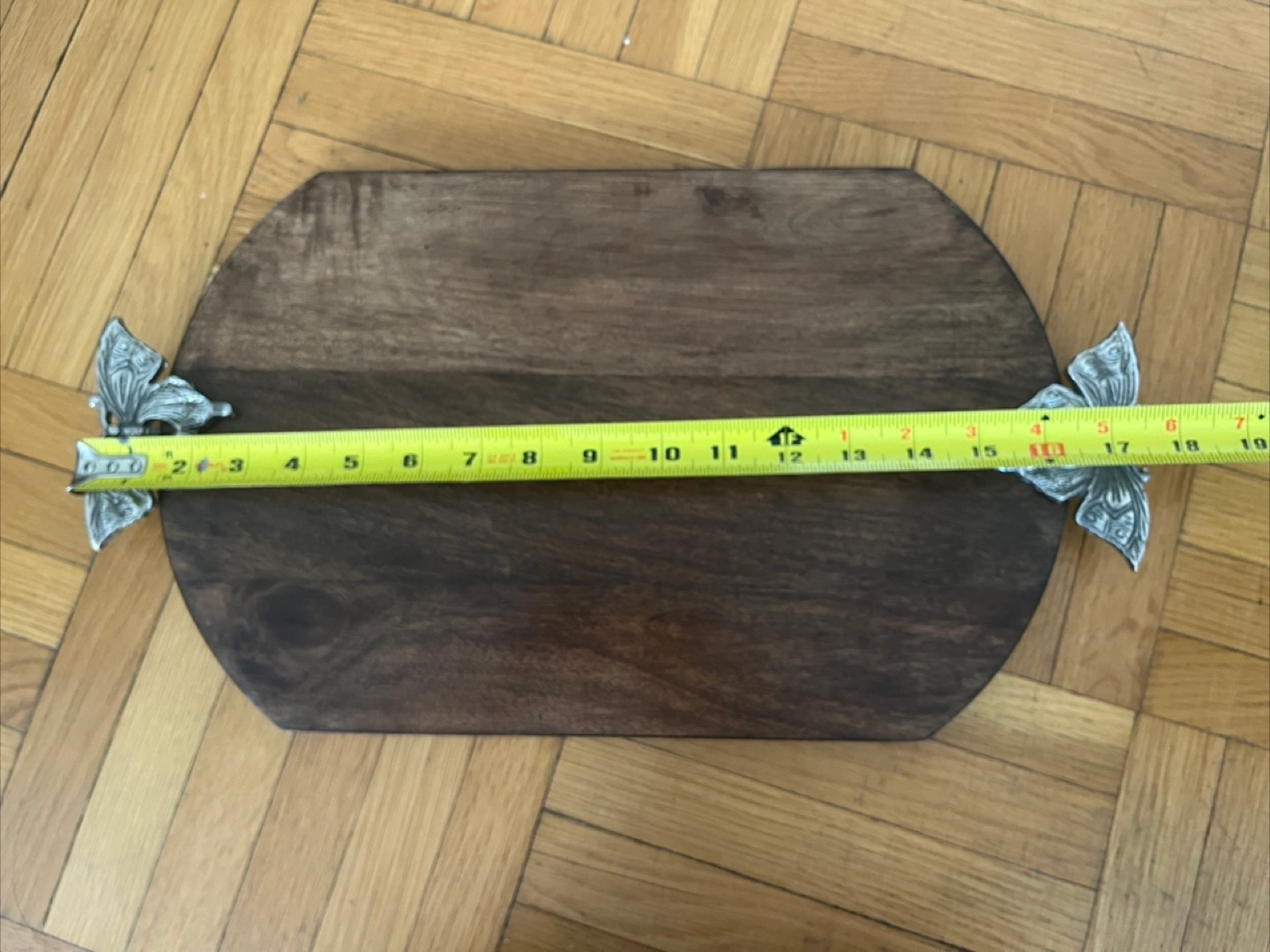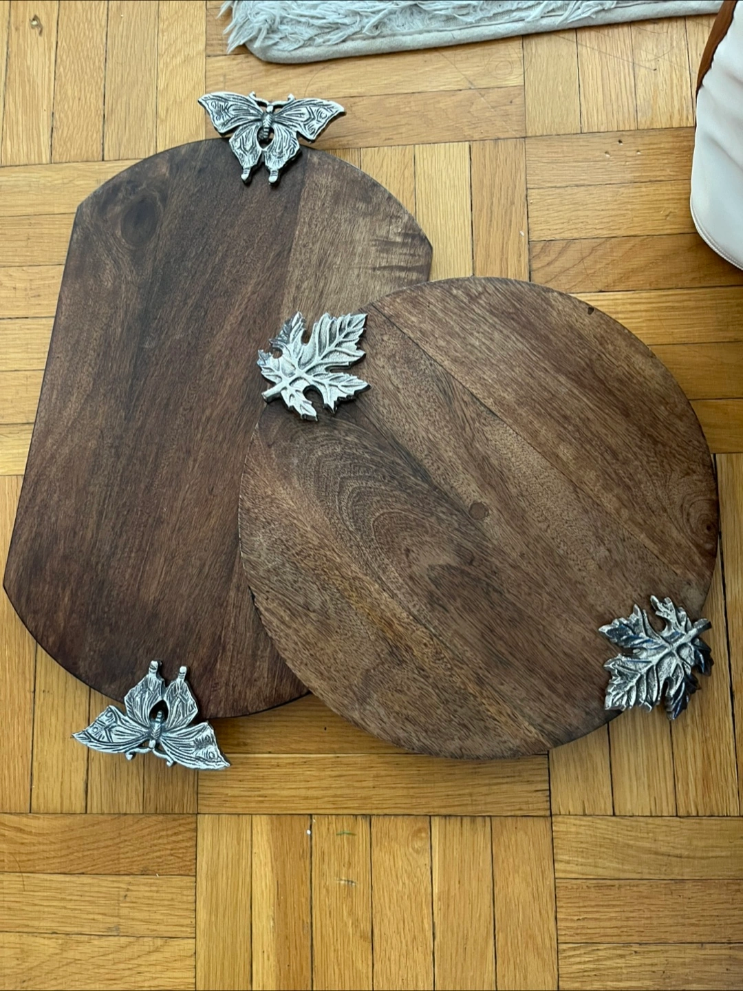 Selling a set of wooden decorative trays, perfect for adding a touch of rustic charm to your home. They come with unique metal handles shaped like leaves and butterflies. The rectangular tray is about 17 inches long and 9 inches wide, while the round one is about 12 inches in diameter. Great for serving or displaying items! $15 each of $30 for both