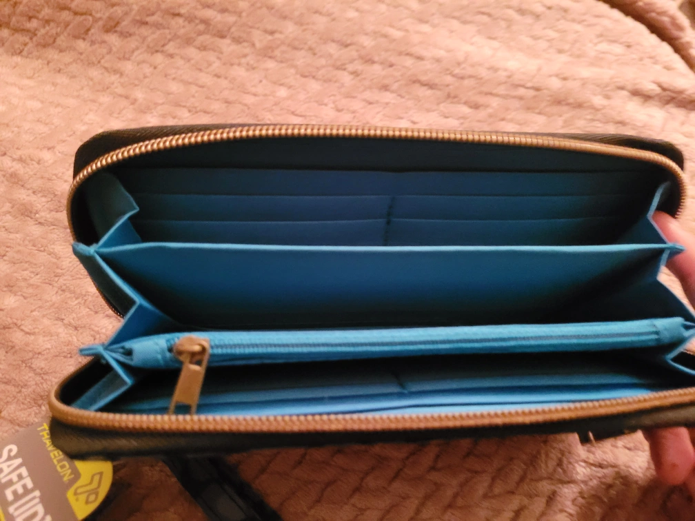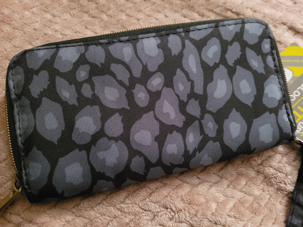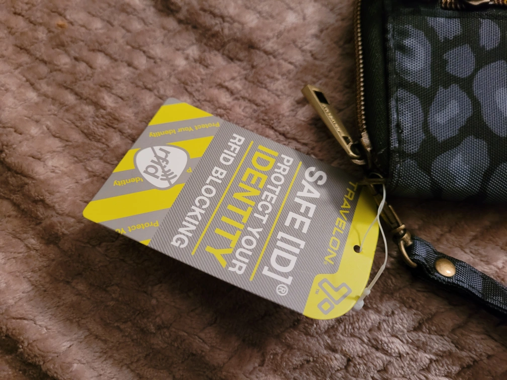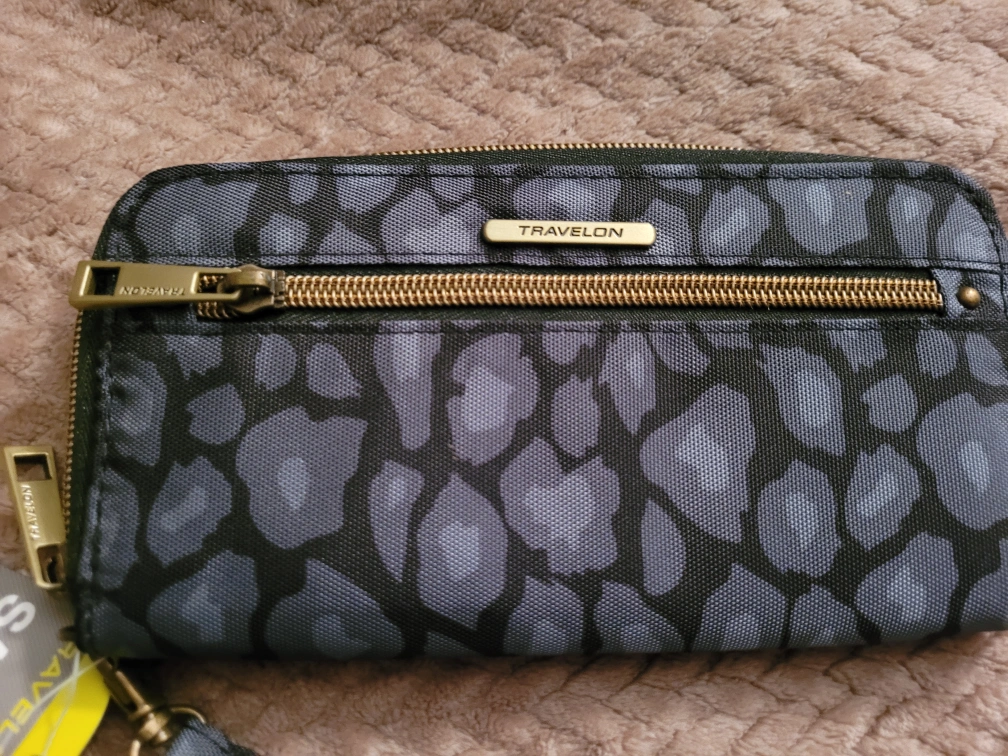This is a Travelon Safe ID wallet with RFID blocking to protect your identity. It features a stylish design and a convenient wrist strap. Perfect for keeping your cards and cash secure!