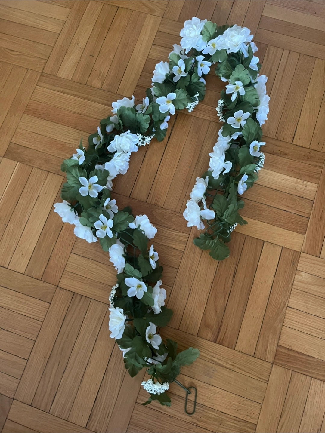 Selling a lovely floral garland featuring white flowers and green leaves. It's perfect for adding a touch of nature to your home decor or for special events. It's in great condition and ready to brighten up any space 7ft long