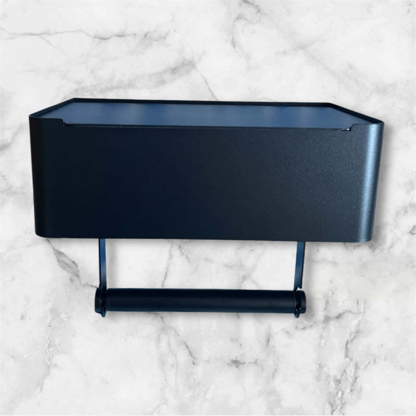 This sleek black metal toilet paper and wipes holder plus also use as a handy shelf on top! It's in new condition and ready to add a modern touch to your bathroom. Perfect for small spaces or anyone who likes a minimalist look. Includes mounting screws.