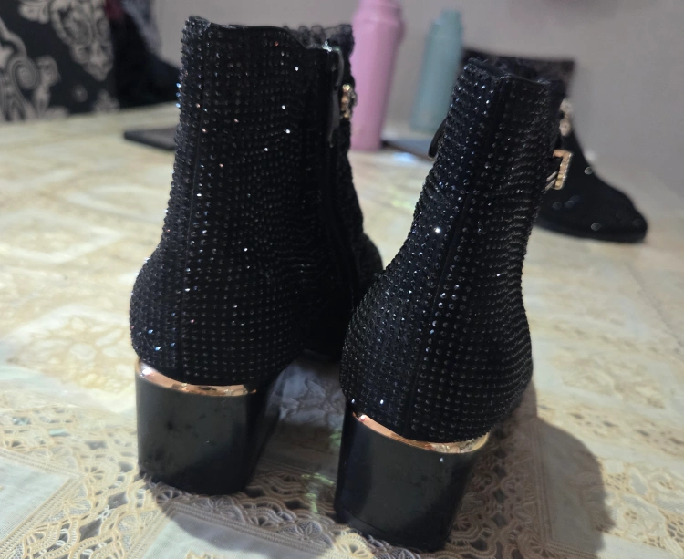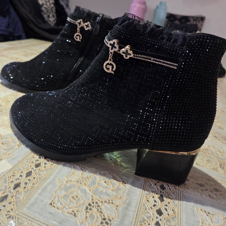 Beautiful women's black ankle boots with glitter design and side zipper. Low block heel with stylish golden touch and decorative charm details. Perfect for party, casual, or festive wear. Condition: used 1day -Like New