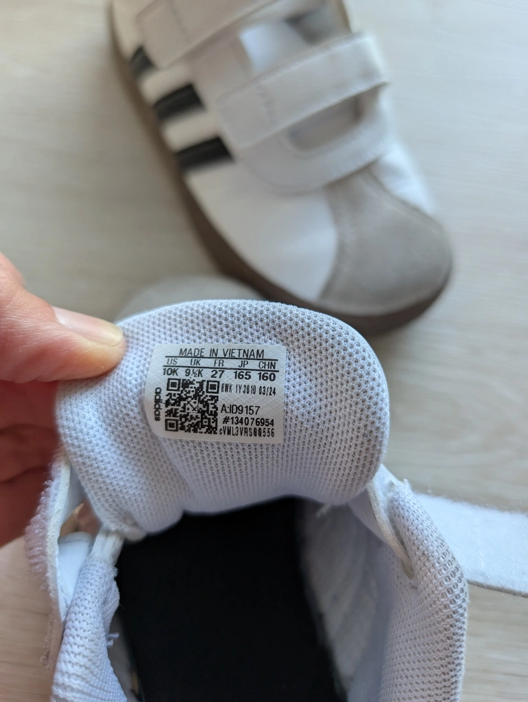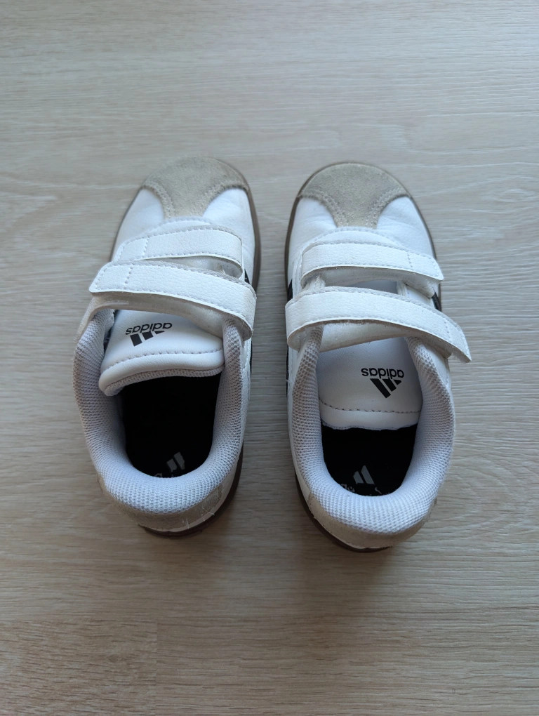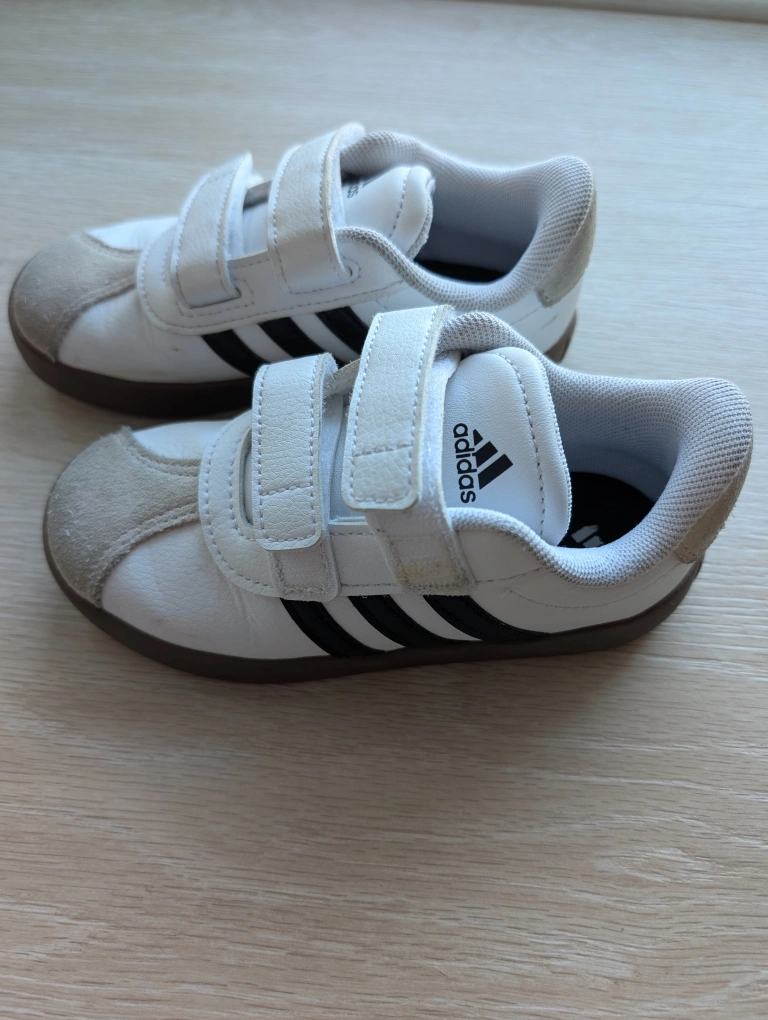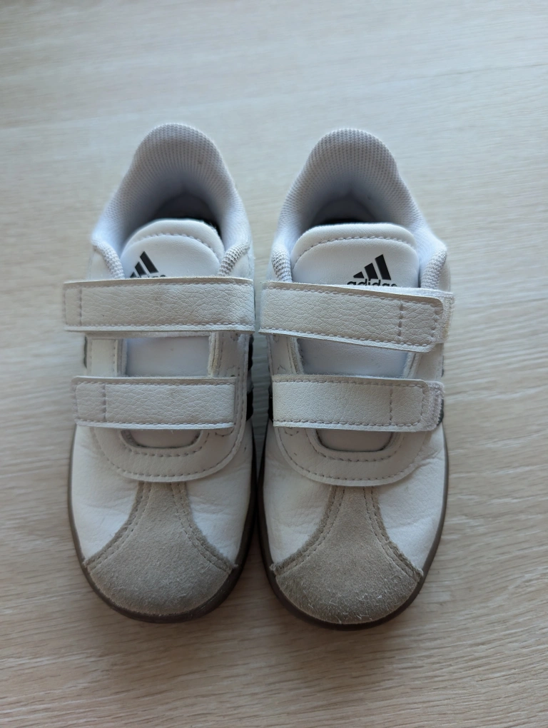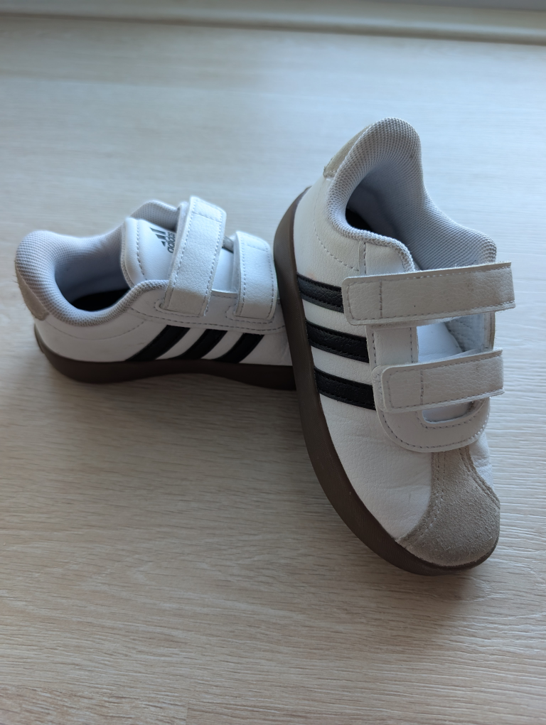 Adidas white sneakers with black stripes. Stylish and versatile, with easy Velcro closure for quick on and off. In great condition, barely used. From a smoke and pet free home.