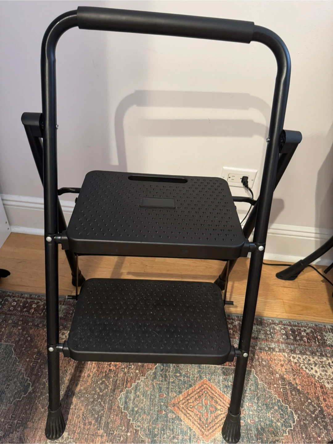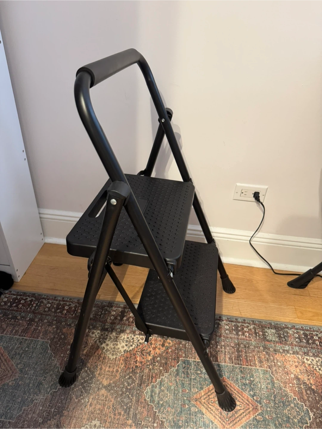 I'm selling a black colour 2-step folding step stool. It can hold up to 800lbs weight. It's in great condition and perfect for reaching those high shelves or doing small tasks around the house! It's lightweight and folds up easily for storage