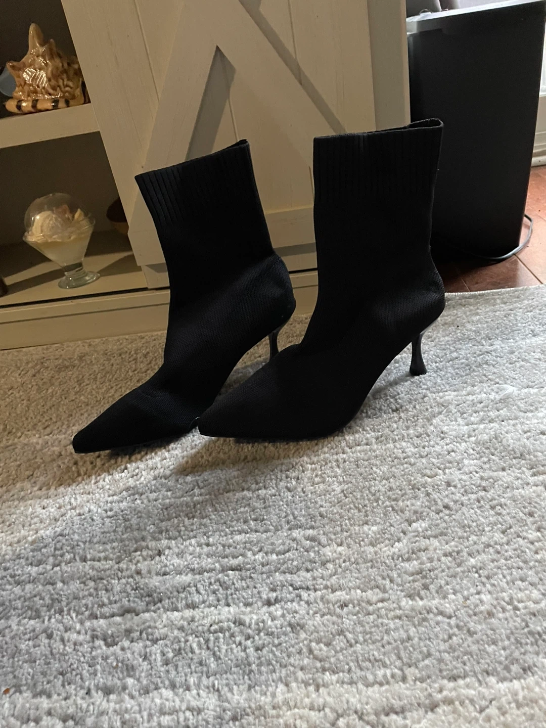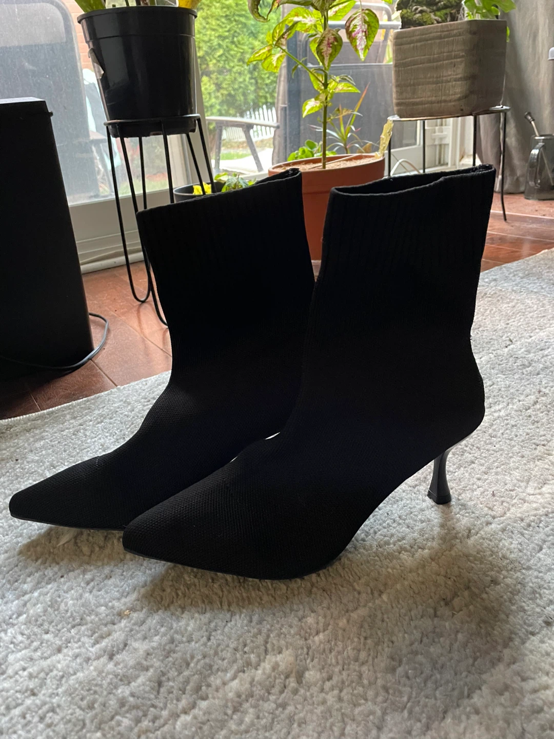 Selling a pair of black knit sock boots. They have a pointed toe and a slim heel.