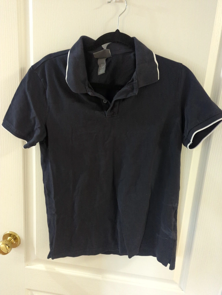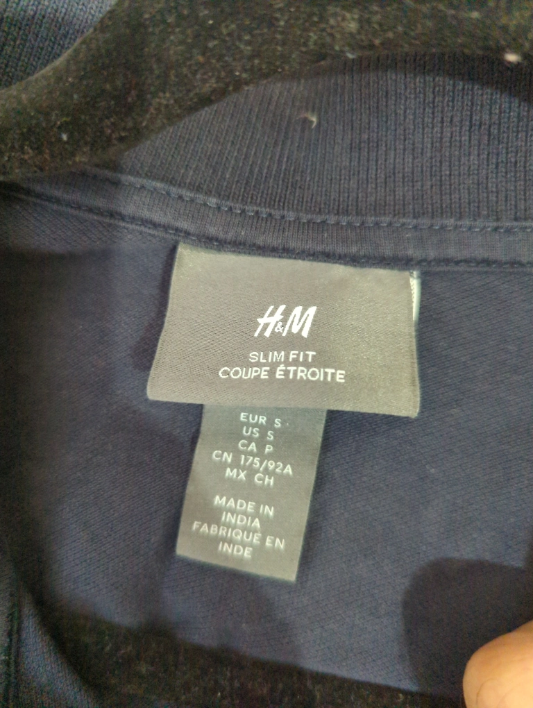 Selling a navy blue H&M polo shirt in size small. It's a slim fit and in great condition. Perfect for casual wear!