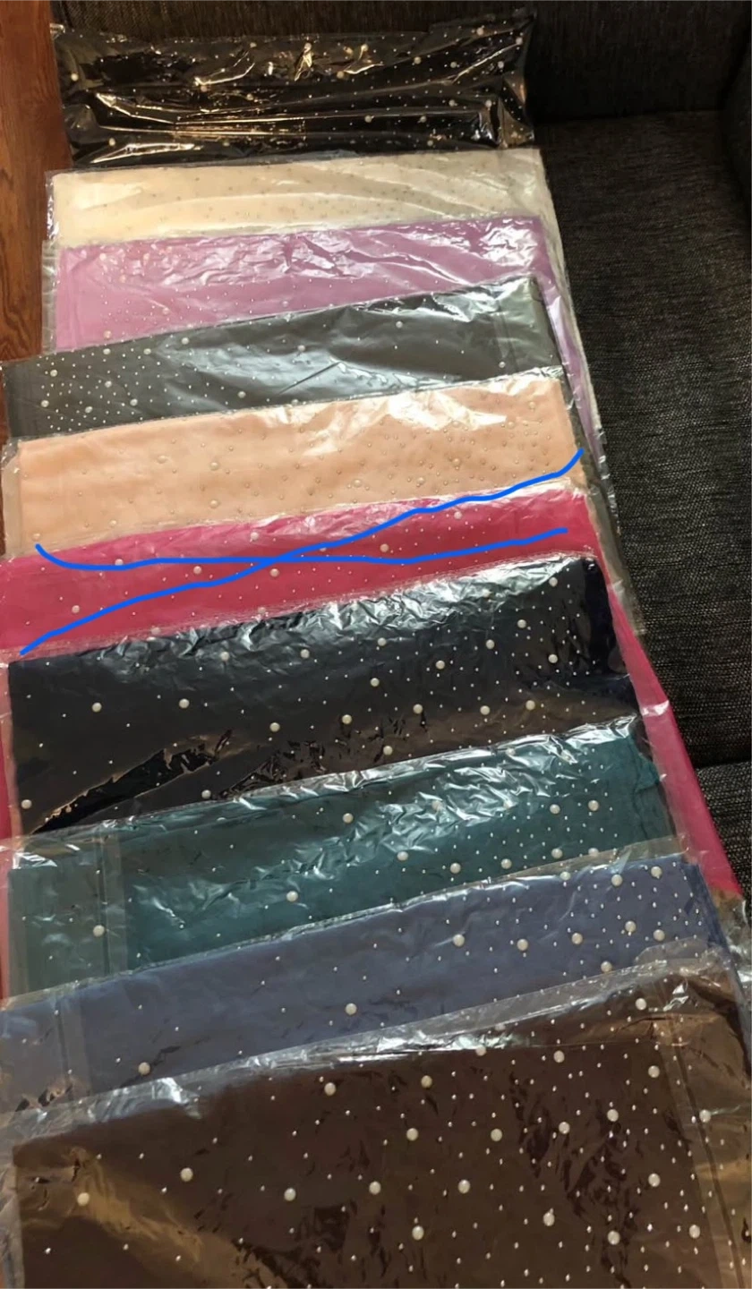 - Thin, teal/turquoise scarf/shawl with white pearls and small, silver rhinestones.