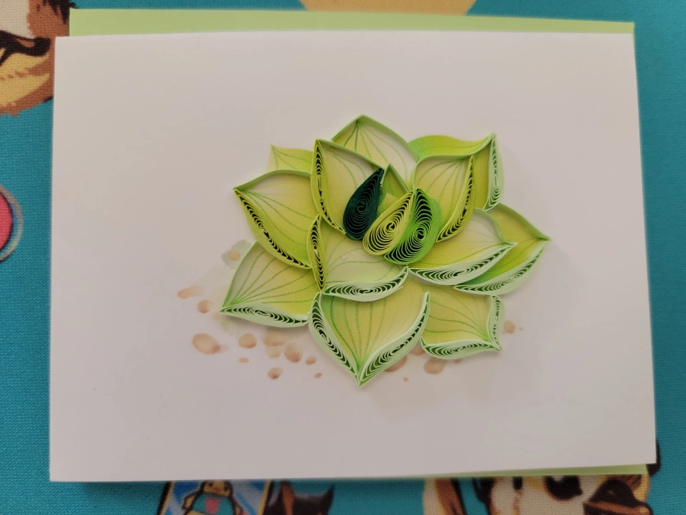 A beautiful Quilling Card featuring a succulent plant design. It's handcrafted in Vietnam and ready to brighten someone's day! The card comes with a matching green envelope. Blank Inside. Size: 2.5 in. x 3.5 in. Open to negotiating the price; please reach out. Thank you for taking a look at my listing! Have a wonderful day.