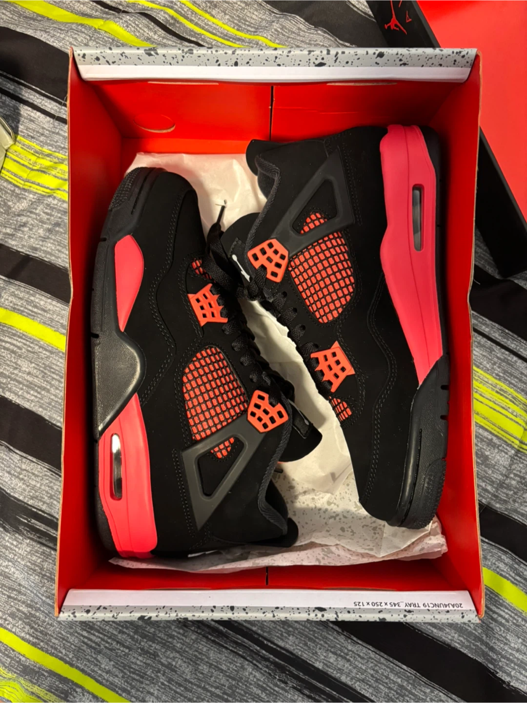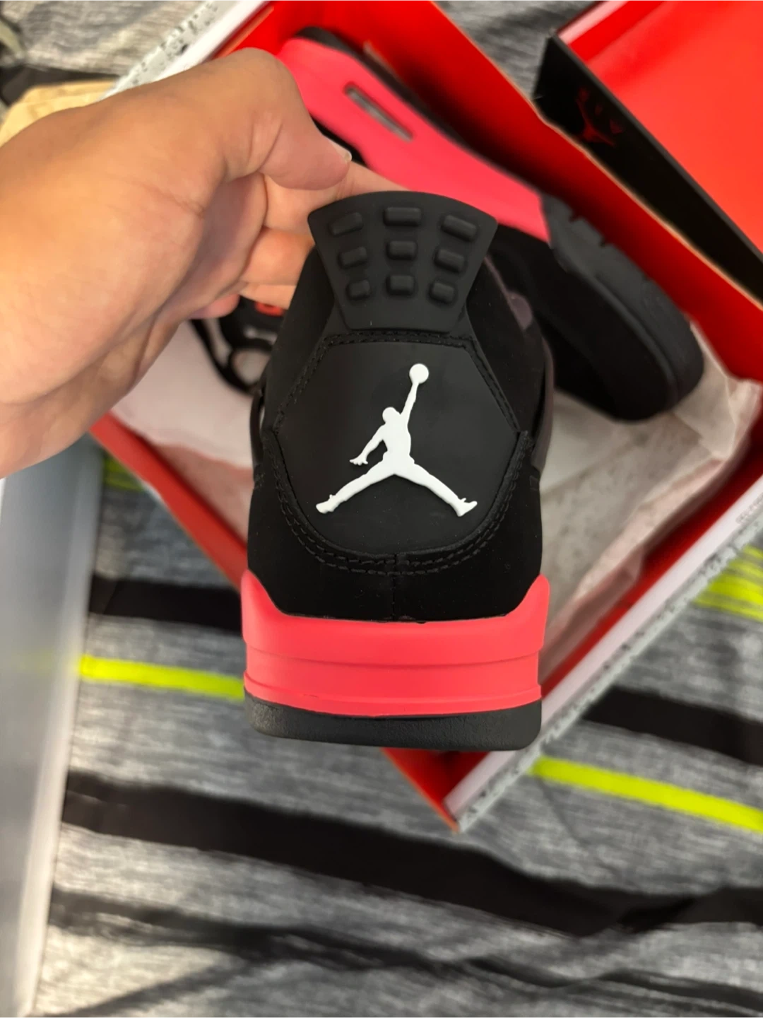 Selling a pair of Air Jordan 4 Retro sneakers in black and fire red. They are a size 9 US. Comes with the original box!
