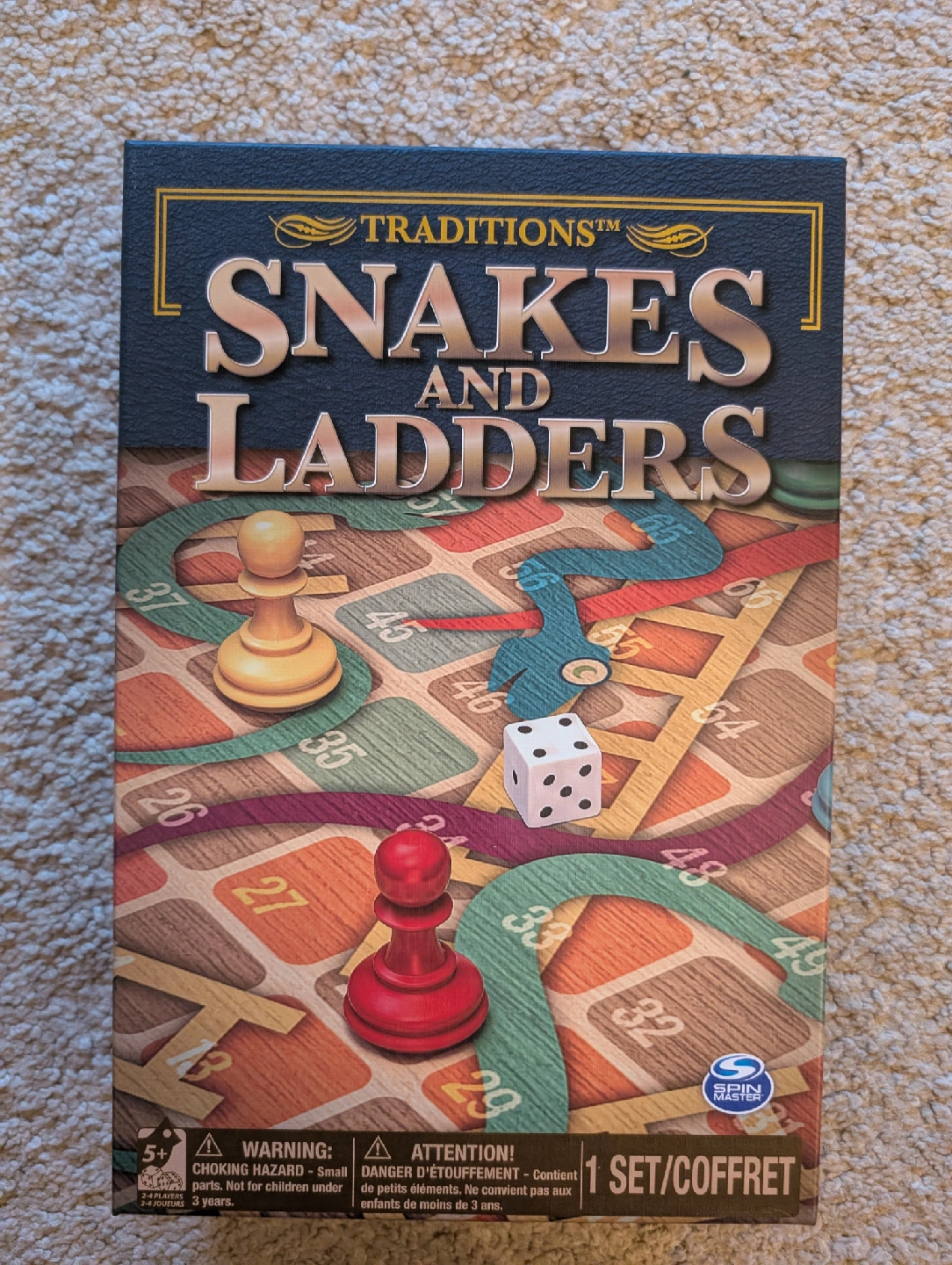 Snakes and Ladders board game by Traditions. It includes a folding game board, coloured game pieces, one die, and instructions. A classic game for the whole family to enjoy!