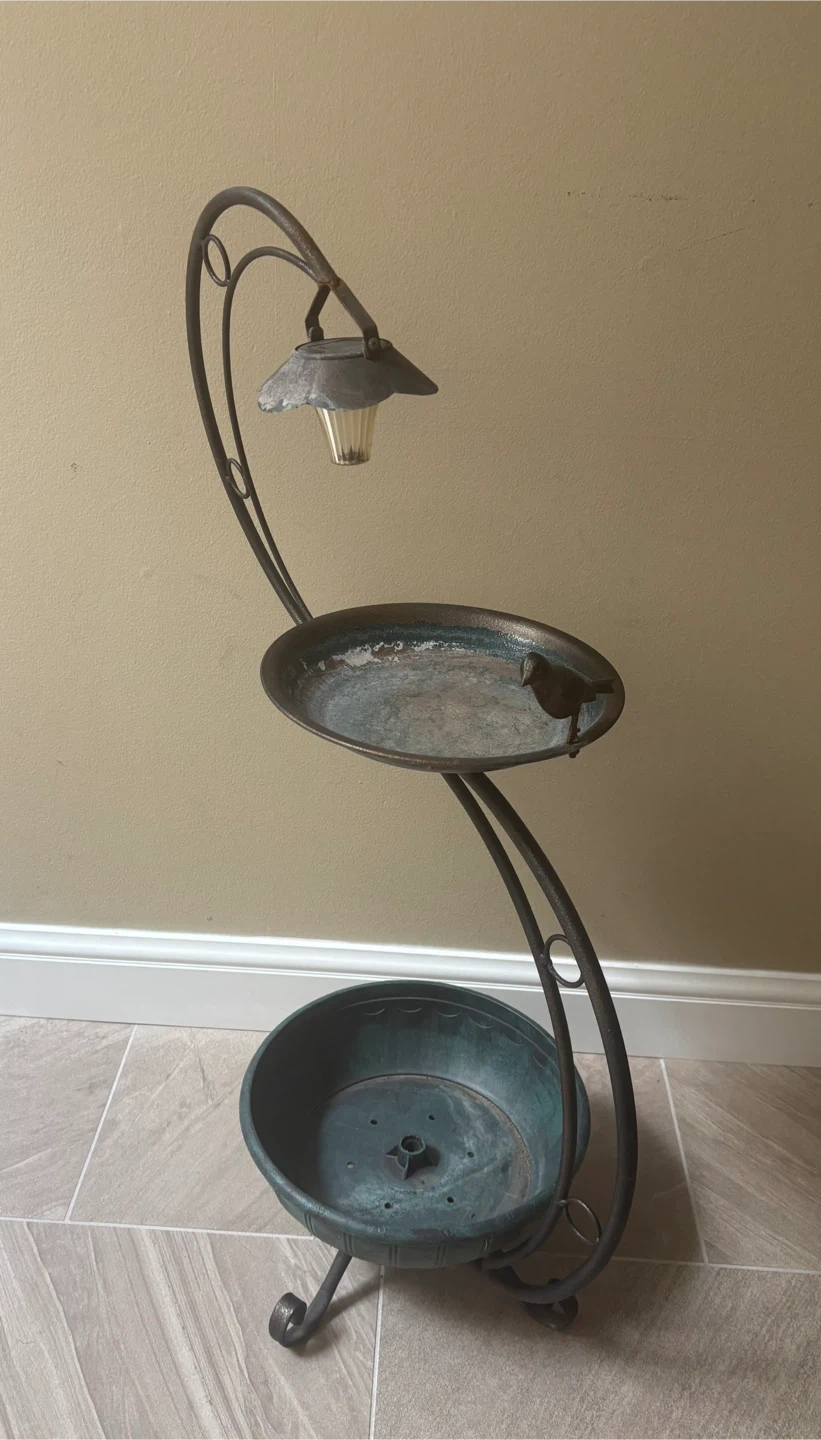 This is a unique metal bird bath with a built-in solar light (solar light is not working). It offer a lovely spot for birds to bathe and a decorative touch to your garden or patio. It was in my garage for a long time.