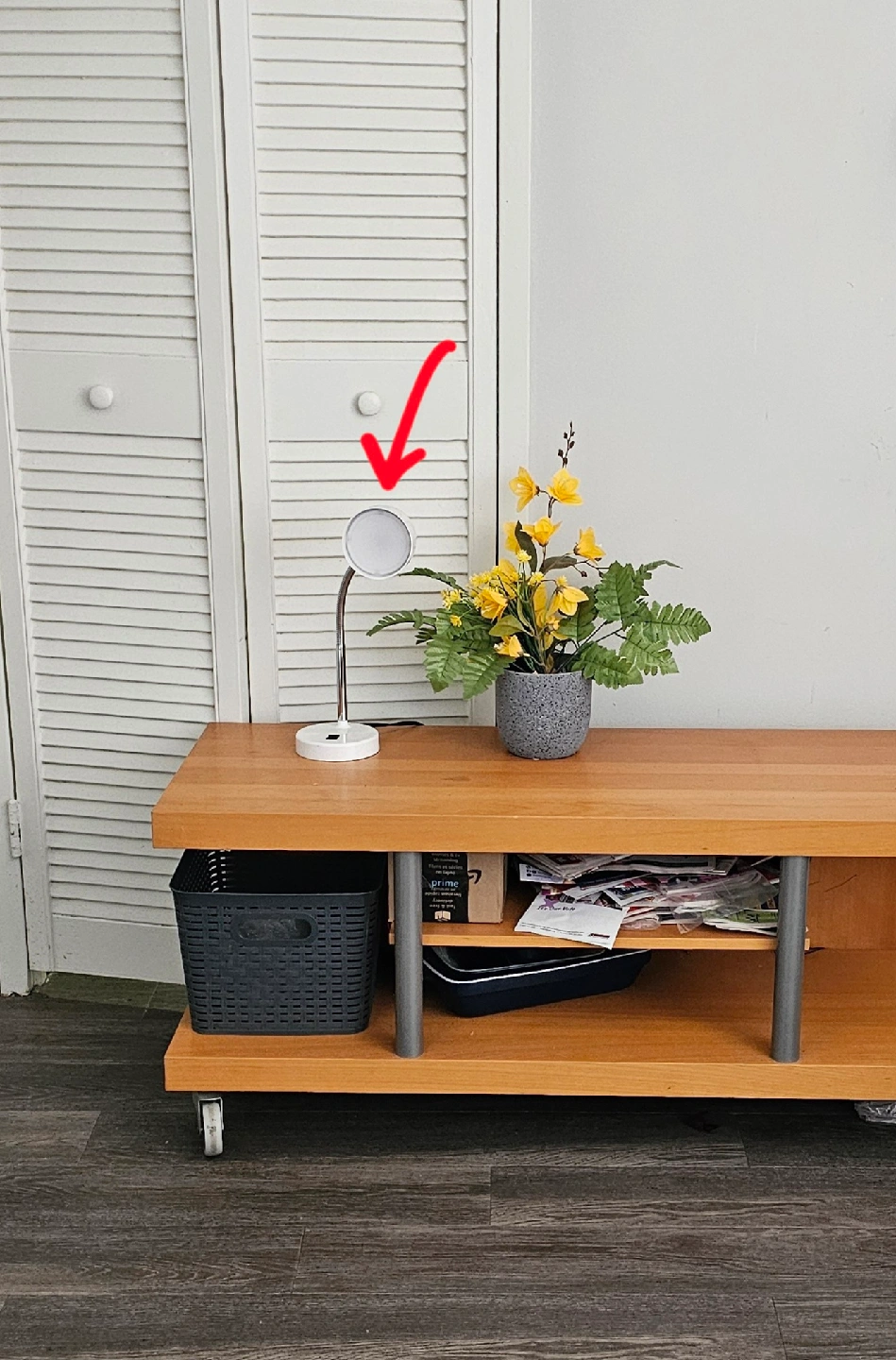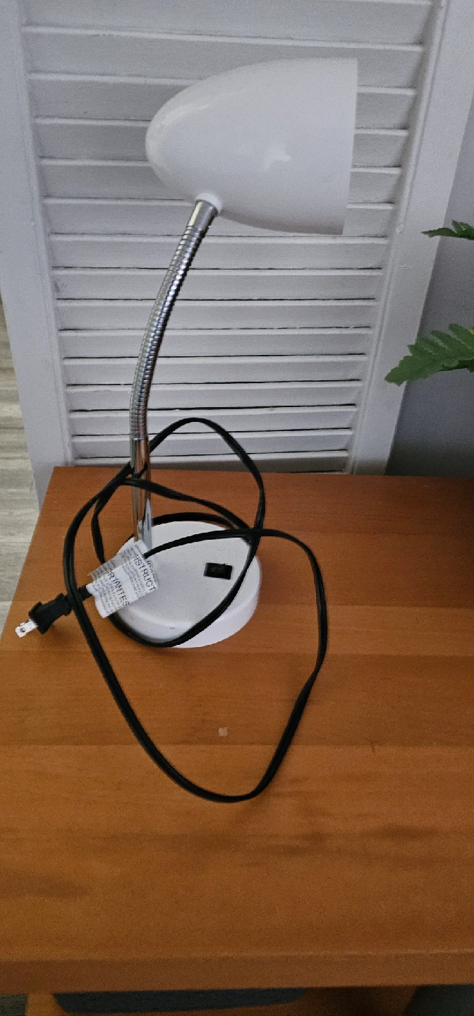 It is very bright. White Light. Works perfect and no issues Here's a simple white gooseneck desk lamp. It's in great shape and perfect for a desk or bedside table. The gooseneck design makes it easy to adjust the light exactly where you need it! Retails for $14.97