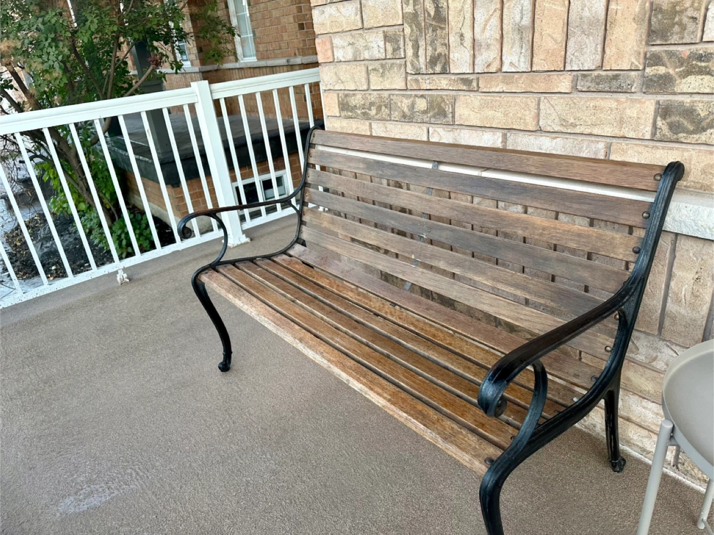 Selling a charming outdoor wooden bench featuring a sturdy black metal frame. It's perfect for adding a touch of rustic elegance to your porch, garden, or patio. The bench is in good condition and ready to provide comfortable seating for you and your guests