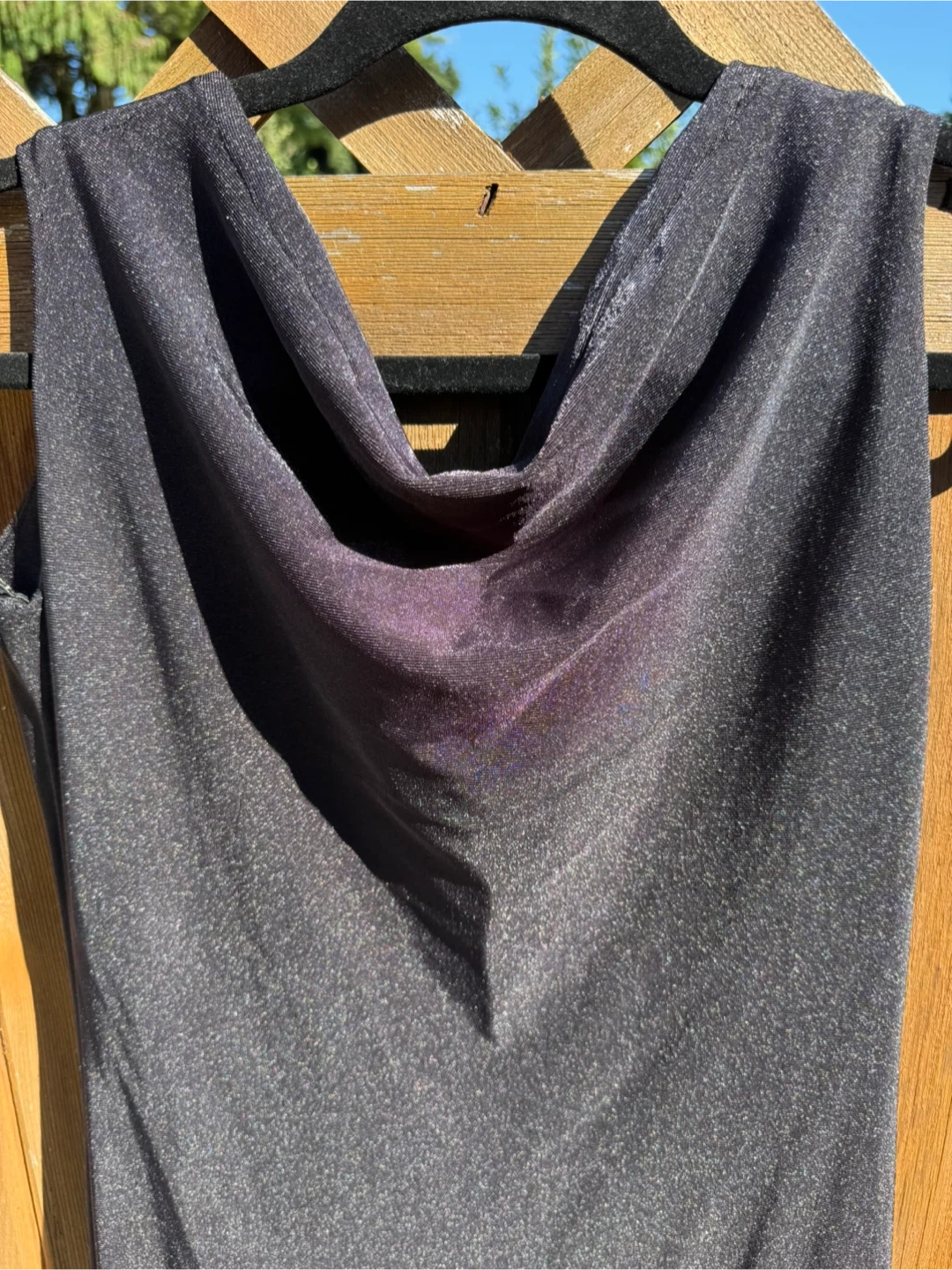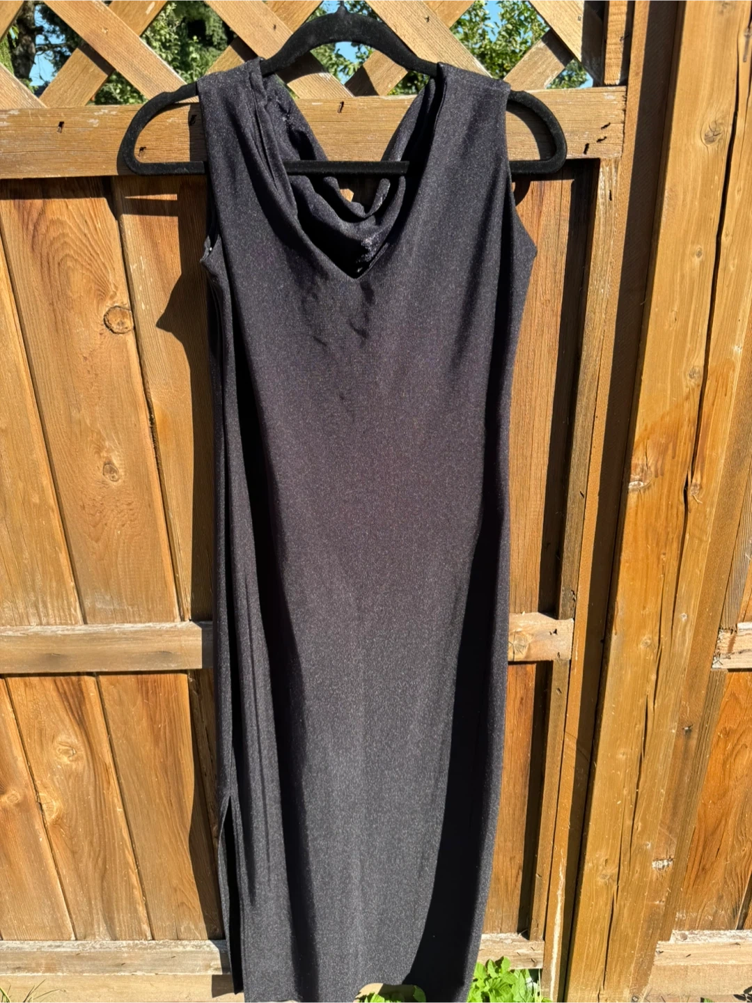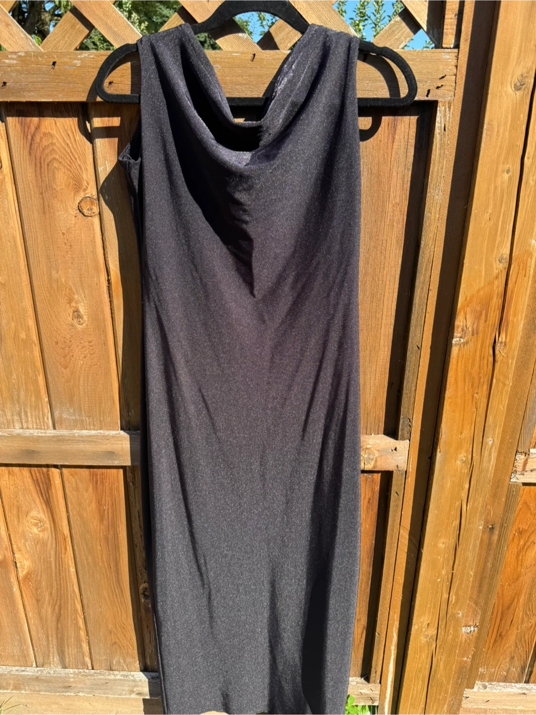 Here's a stylish black dress with a cowl neck design! It's a sleek and simple piece that's perfect for dressing up or down. The dress has a comfortable fit and a side slit for added flair. It's in good condition and ready for a new home