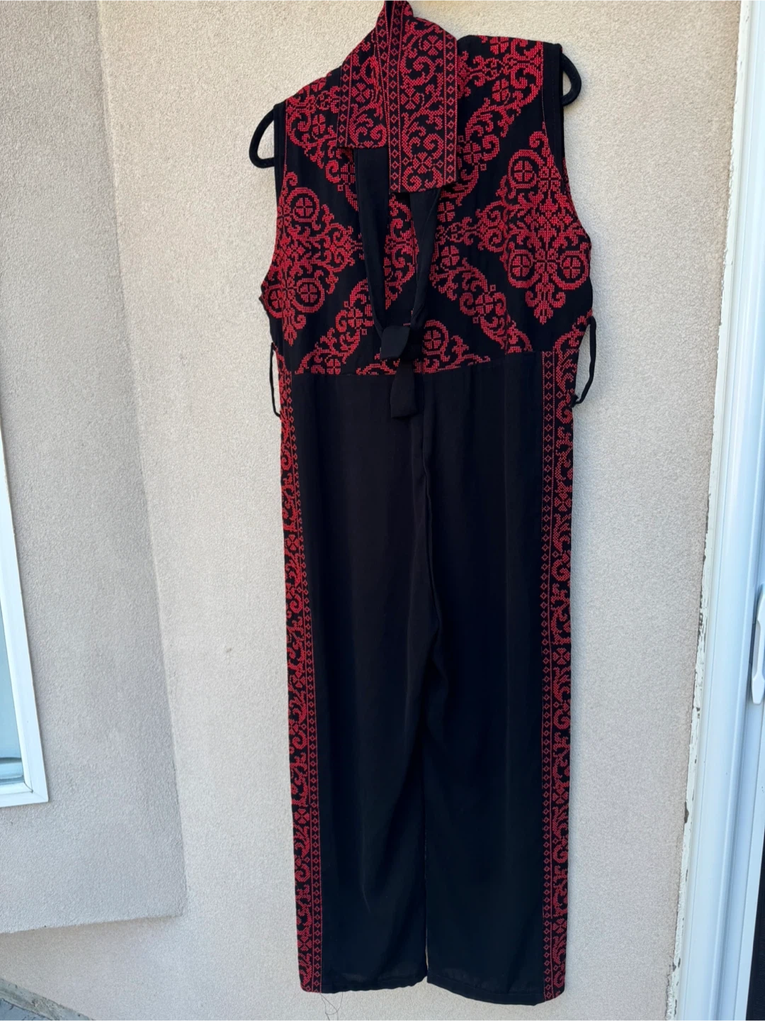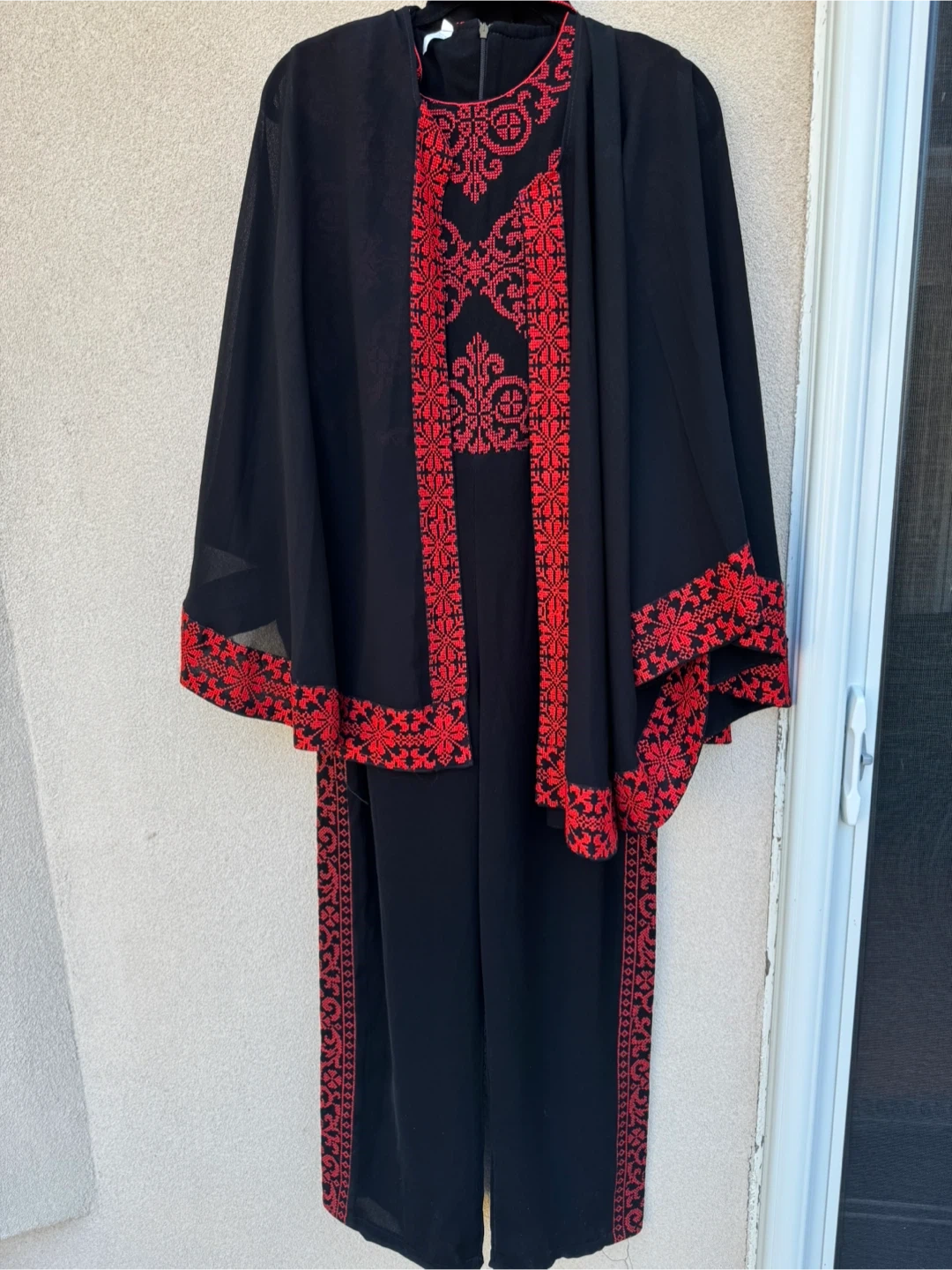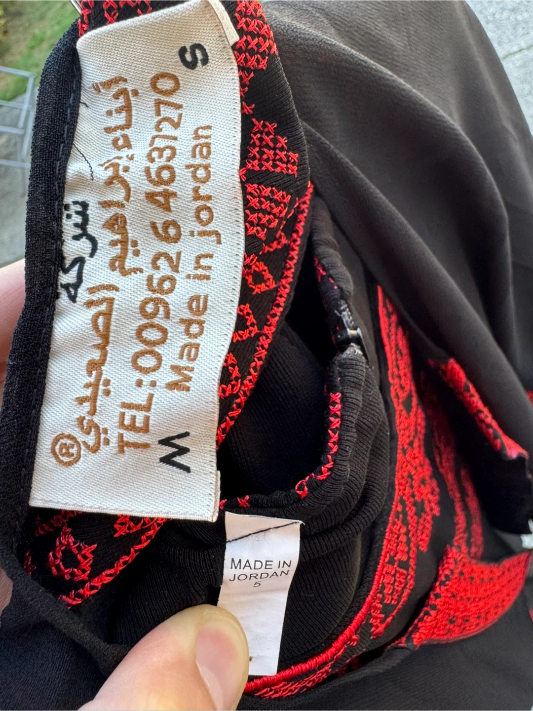 Beautiful, traditional thobe dress in black with red embroidery. Size M. Made in Jordan. Perfect for cultural events or as a statement piece!
