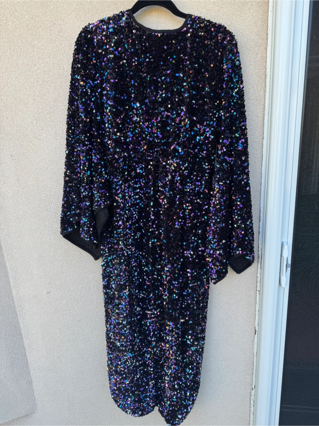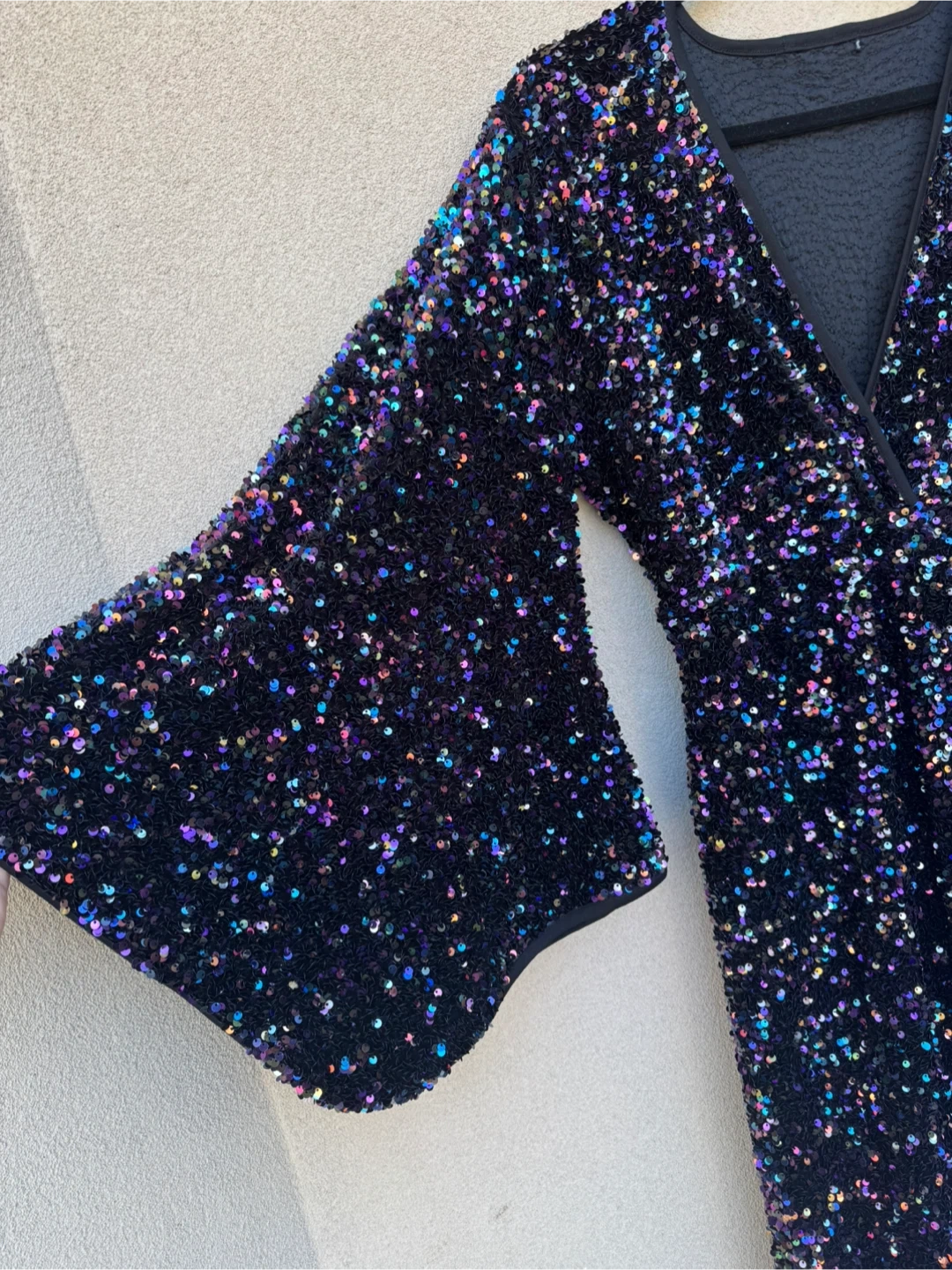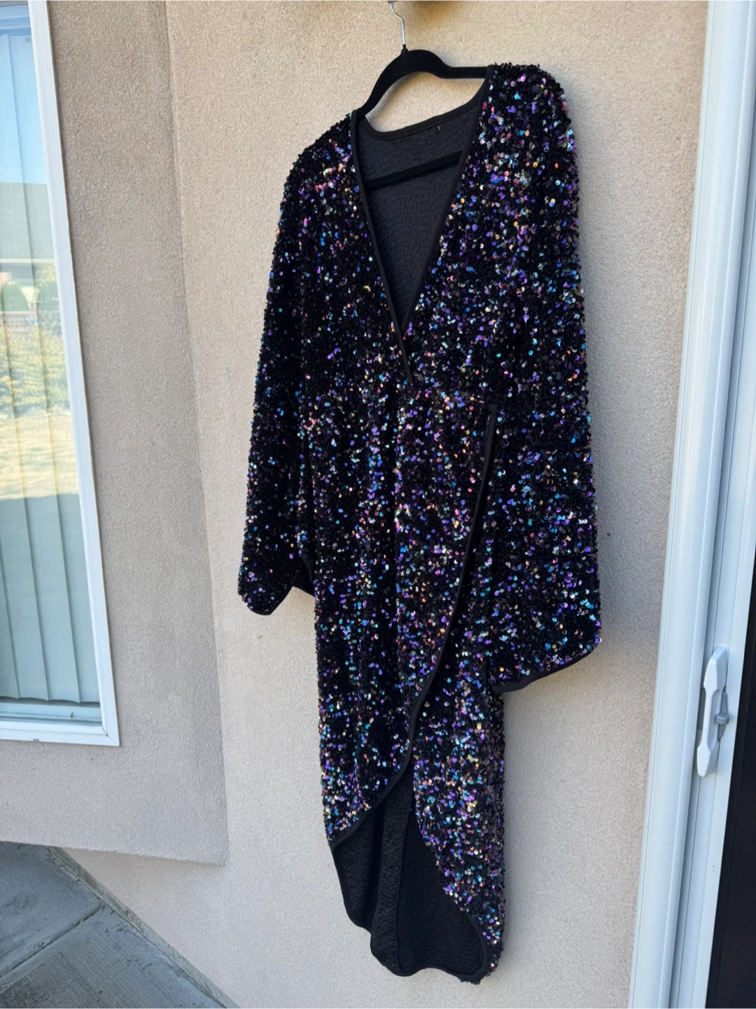 Selling a fun and sparkly sequin dress! It's black with multi-coloured sequins and has a flattering wrap style. Perfect for a night out or any special occasion!