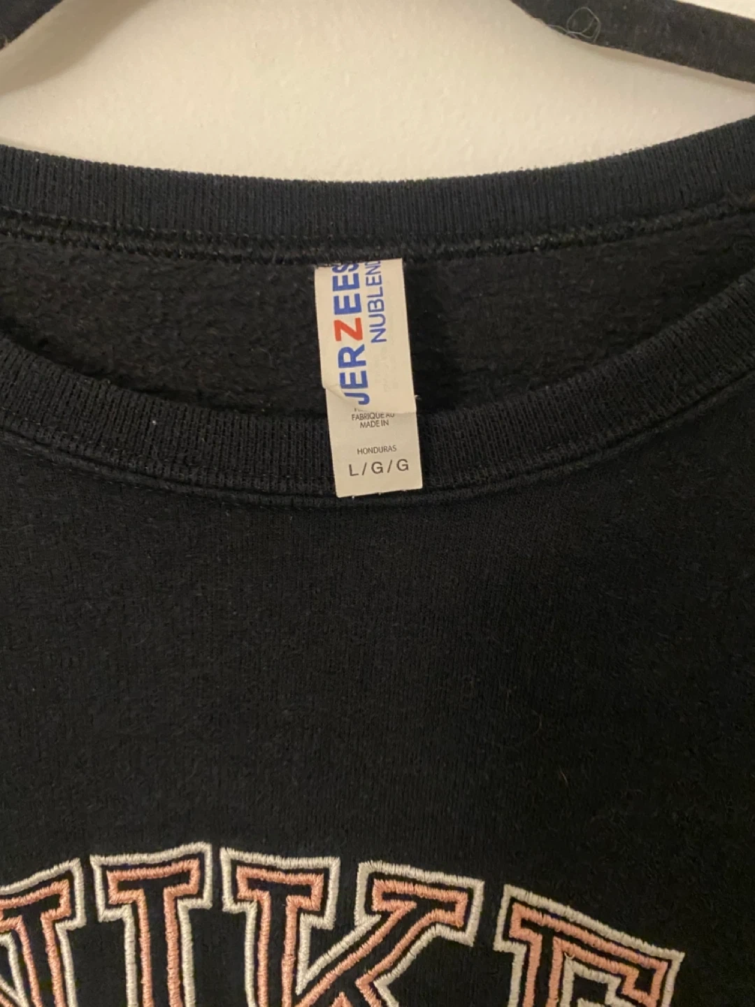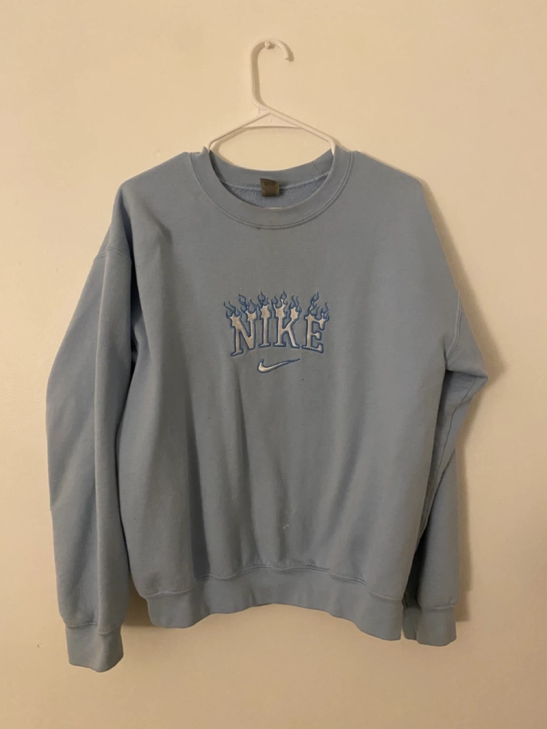 One is black with a pink and white embroidered Nike logo, and the other is a light blue with a flame-style Nike logo. Both are size Large and in good condition. Perfect for staying cozy this fall
