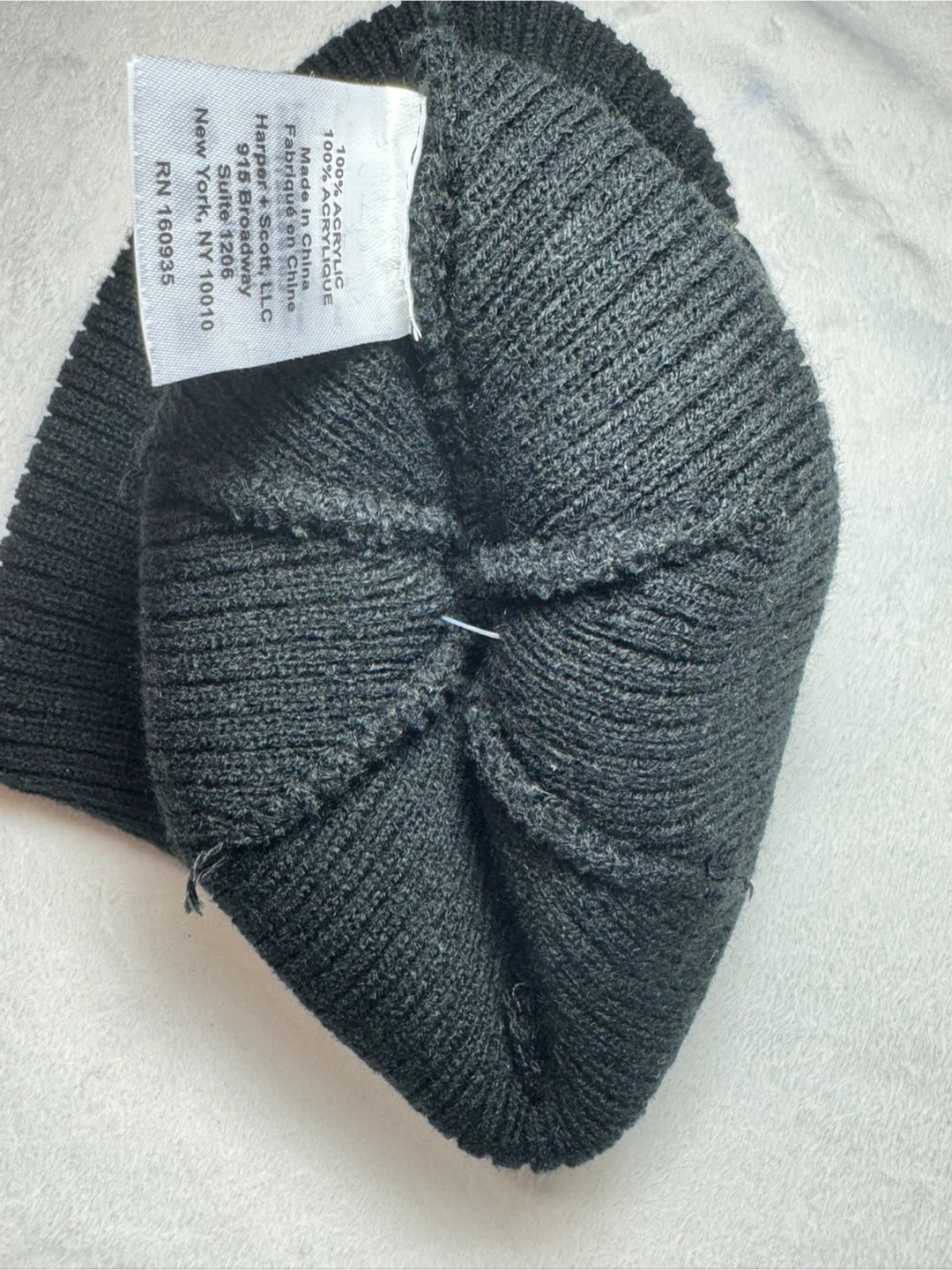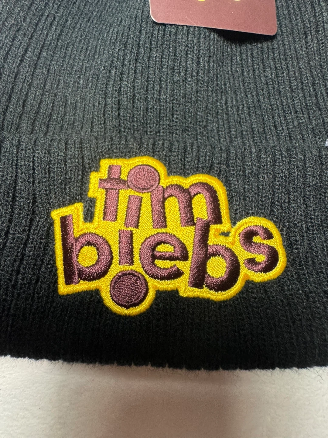 It's a black knit toque with the "Tim Biebs" logo in yellow and brown.