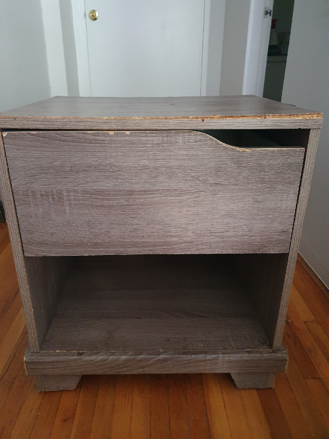 Selling a wood-look nightstand. It has a drawer and an open shelf for storage. There are some signs of wear and tear, as shown in the pictures