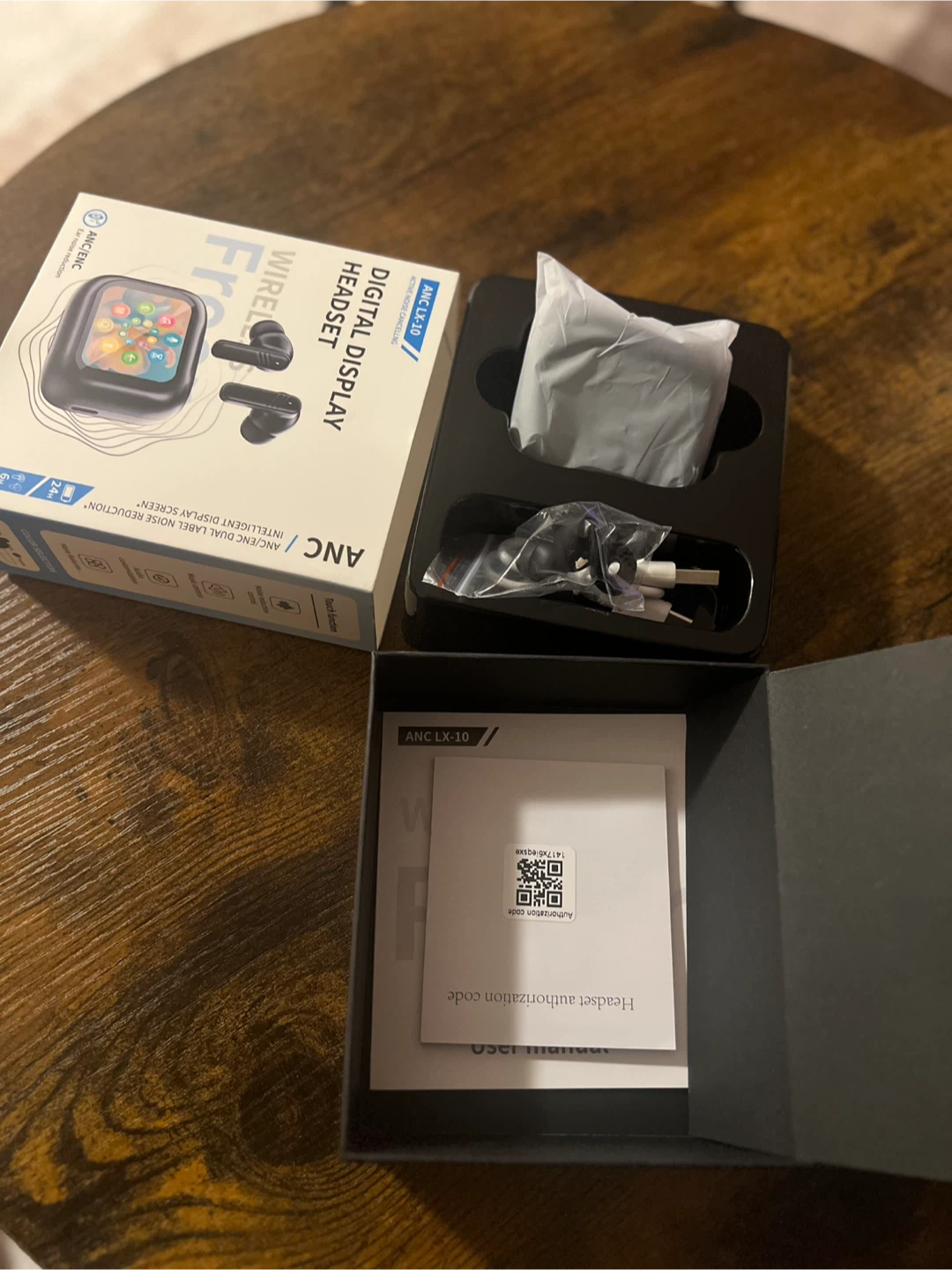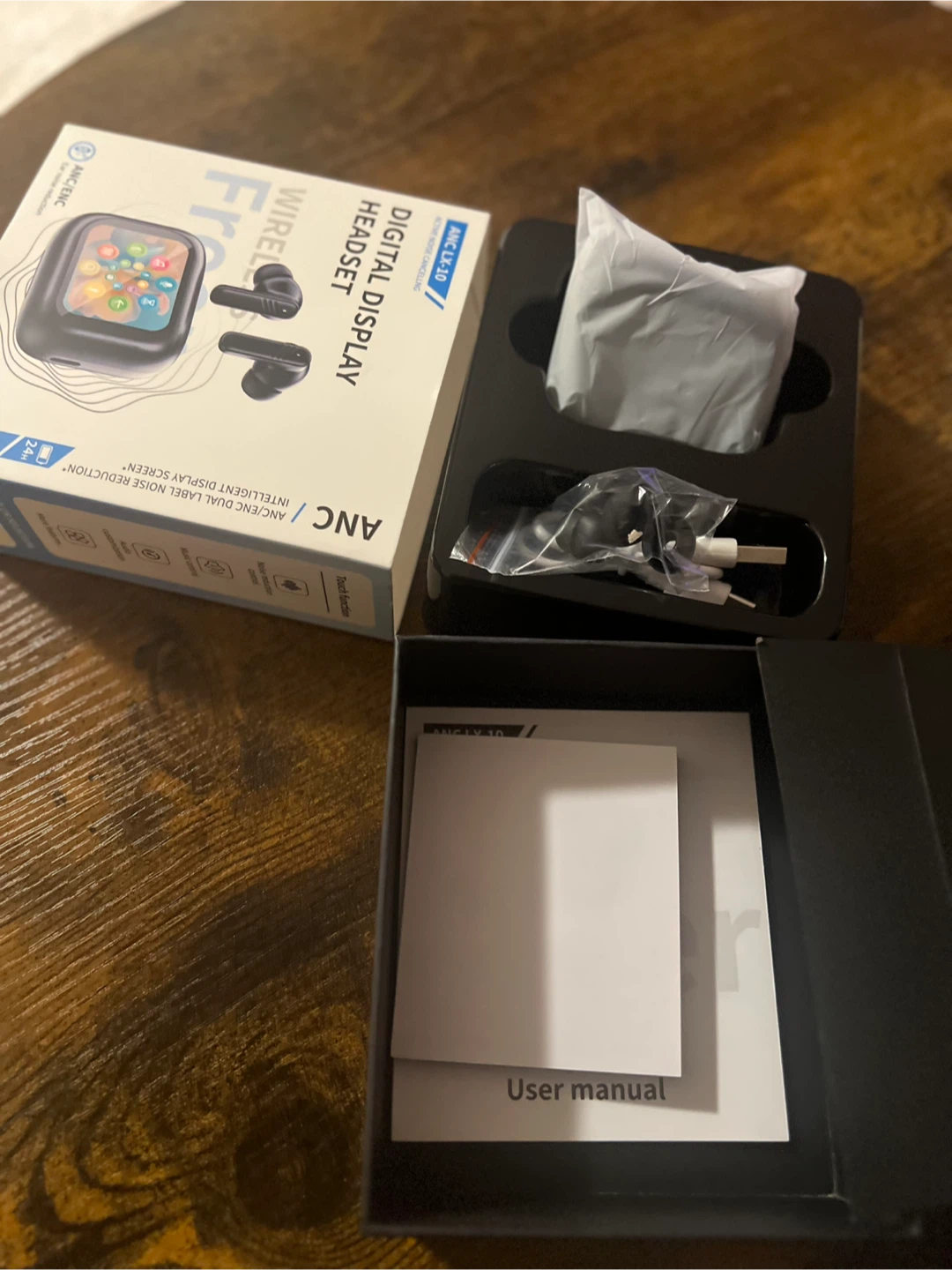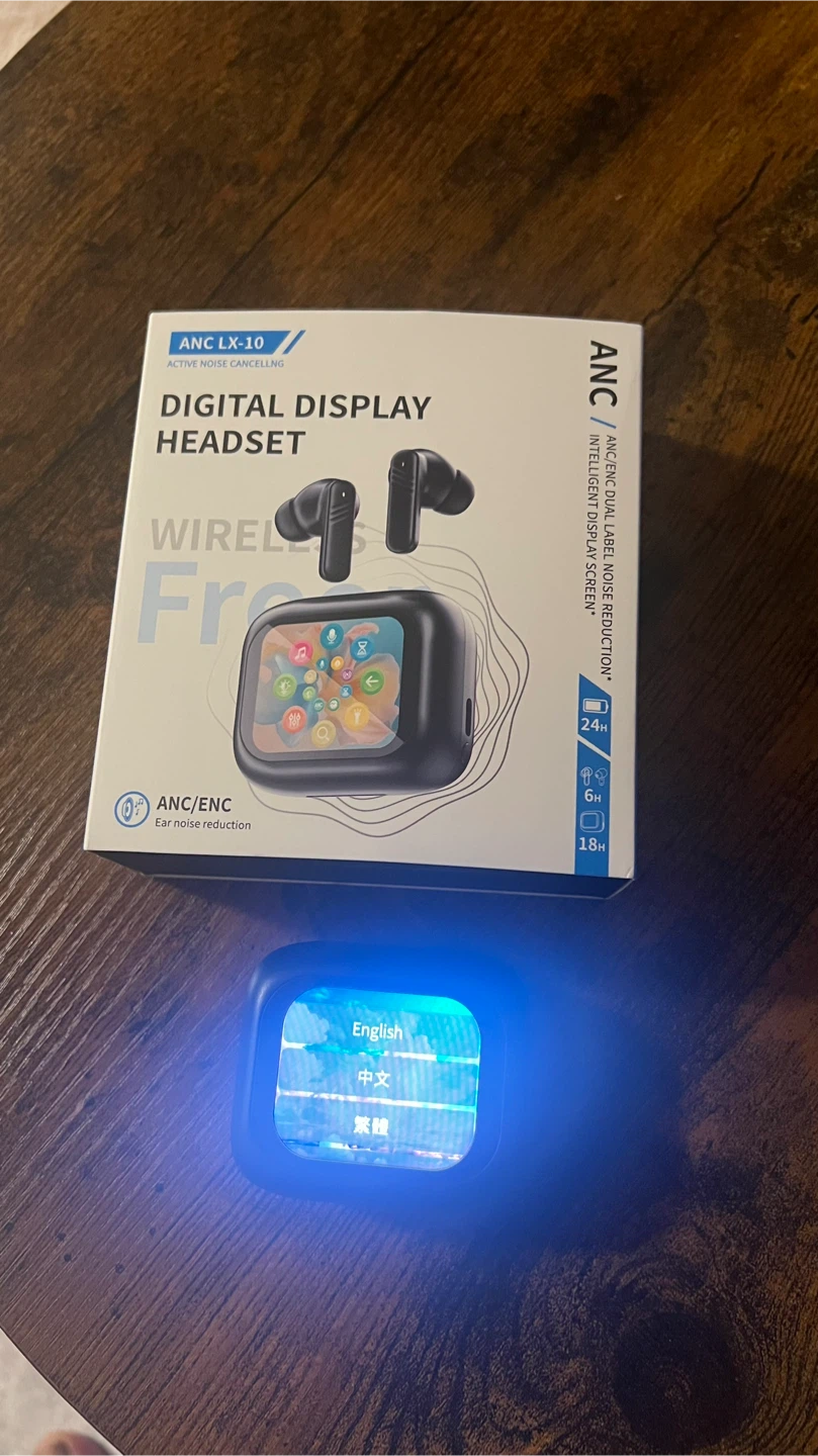 Selling a set of ANC LX-10 wireless earbuds with a digital display headset. The box is included, along with the user manual and charging cable. These earbuds feature active noise cancelling (ANC/ENC) for ear noise reduction and offer up to 24 hours of playtime. They are new never used