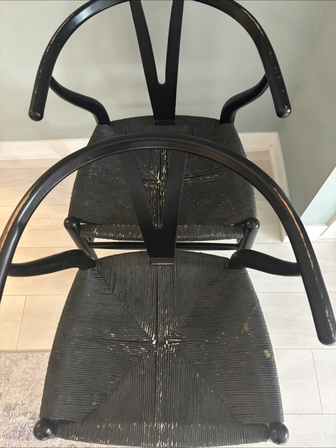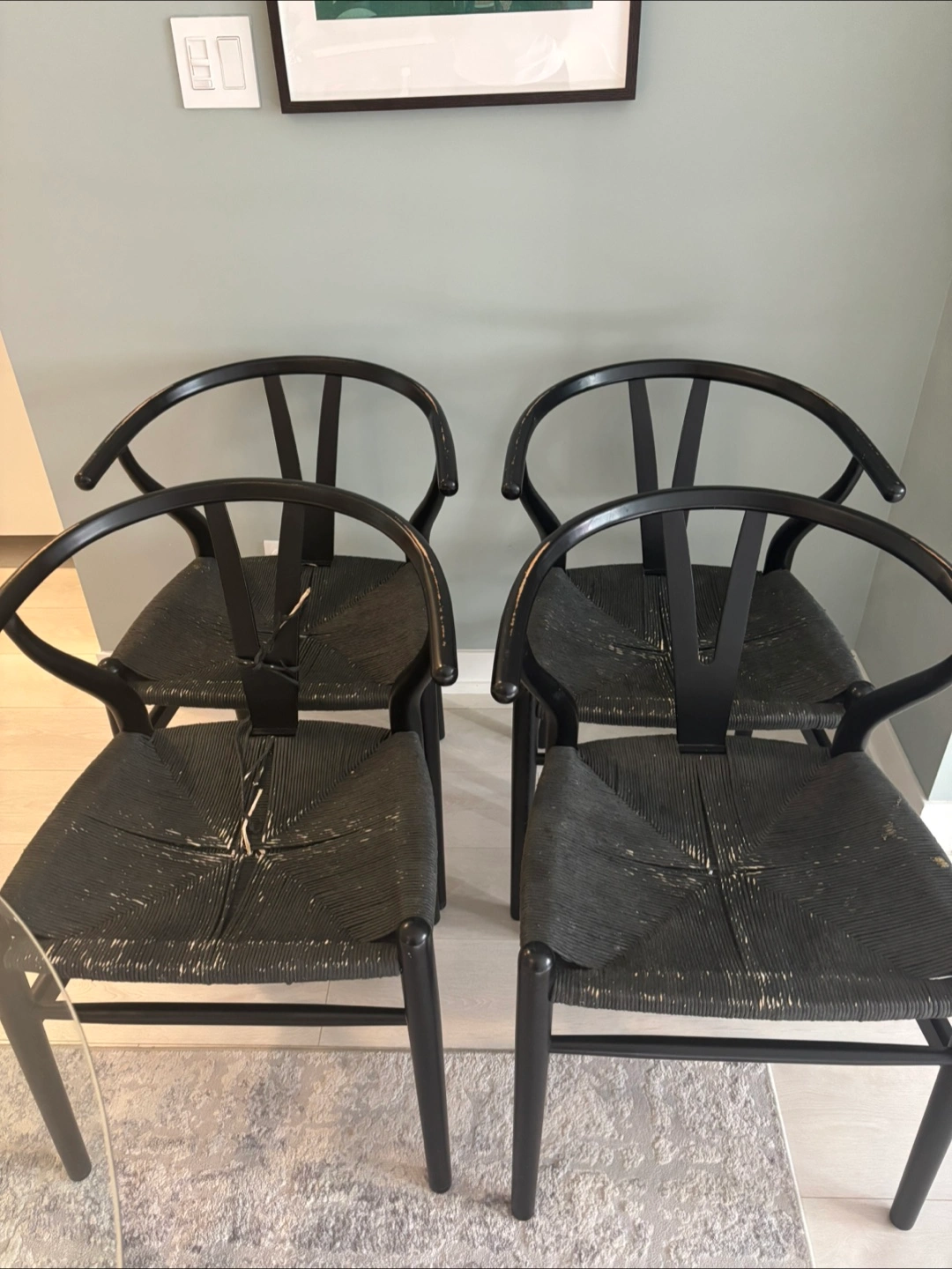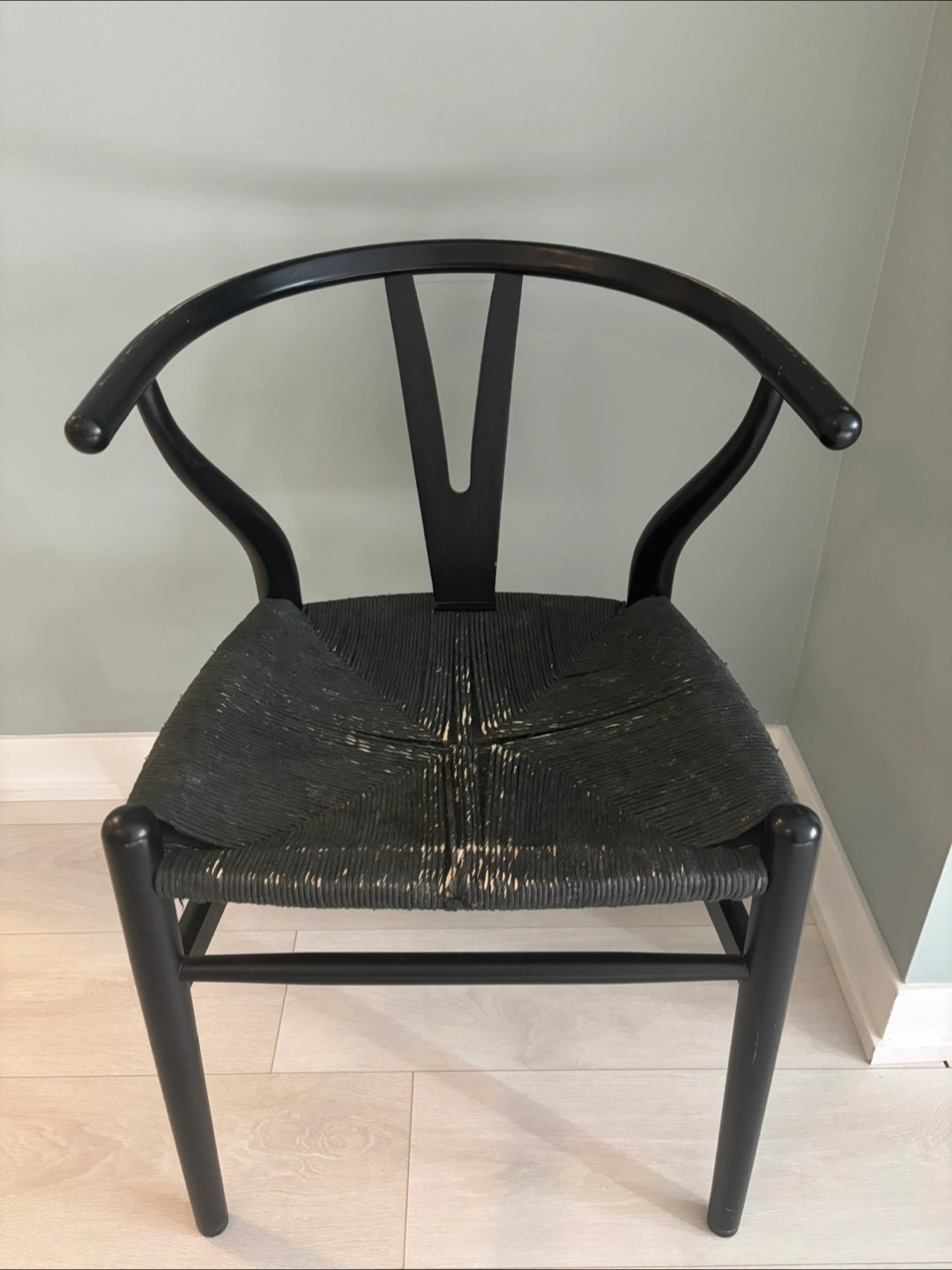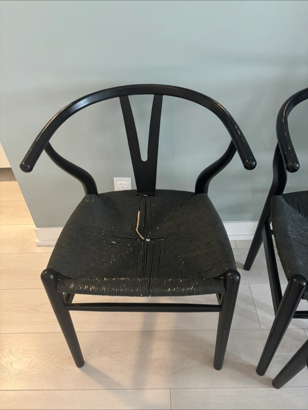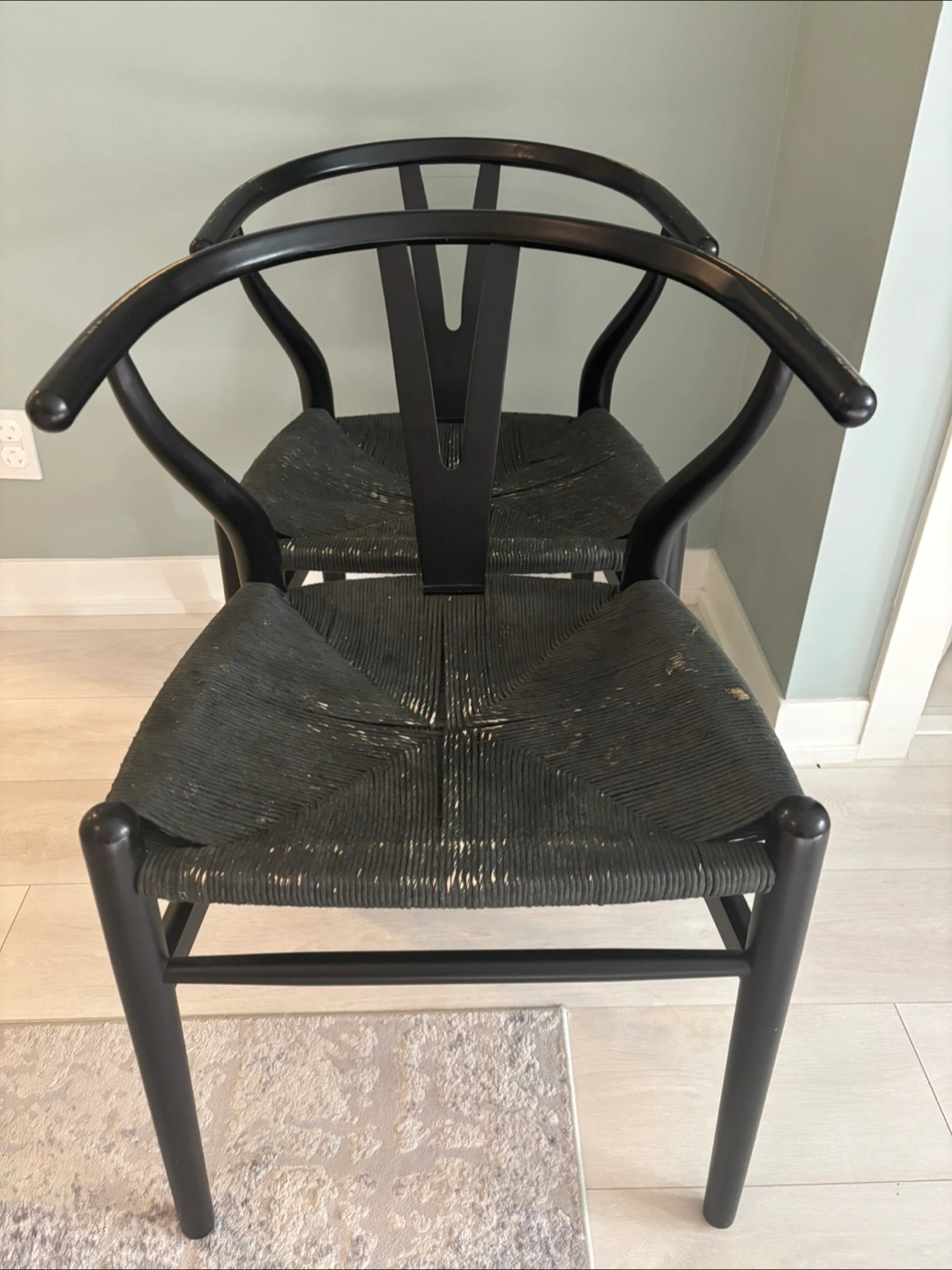 Selling a set of four black wishbone chairs. They show some signs of use, but are still sturdy and stylish. Perfect for anyone who’s willing to repair the papercords, though they’re still functional.