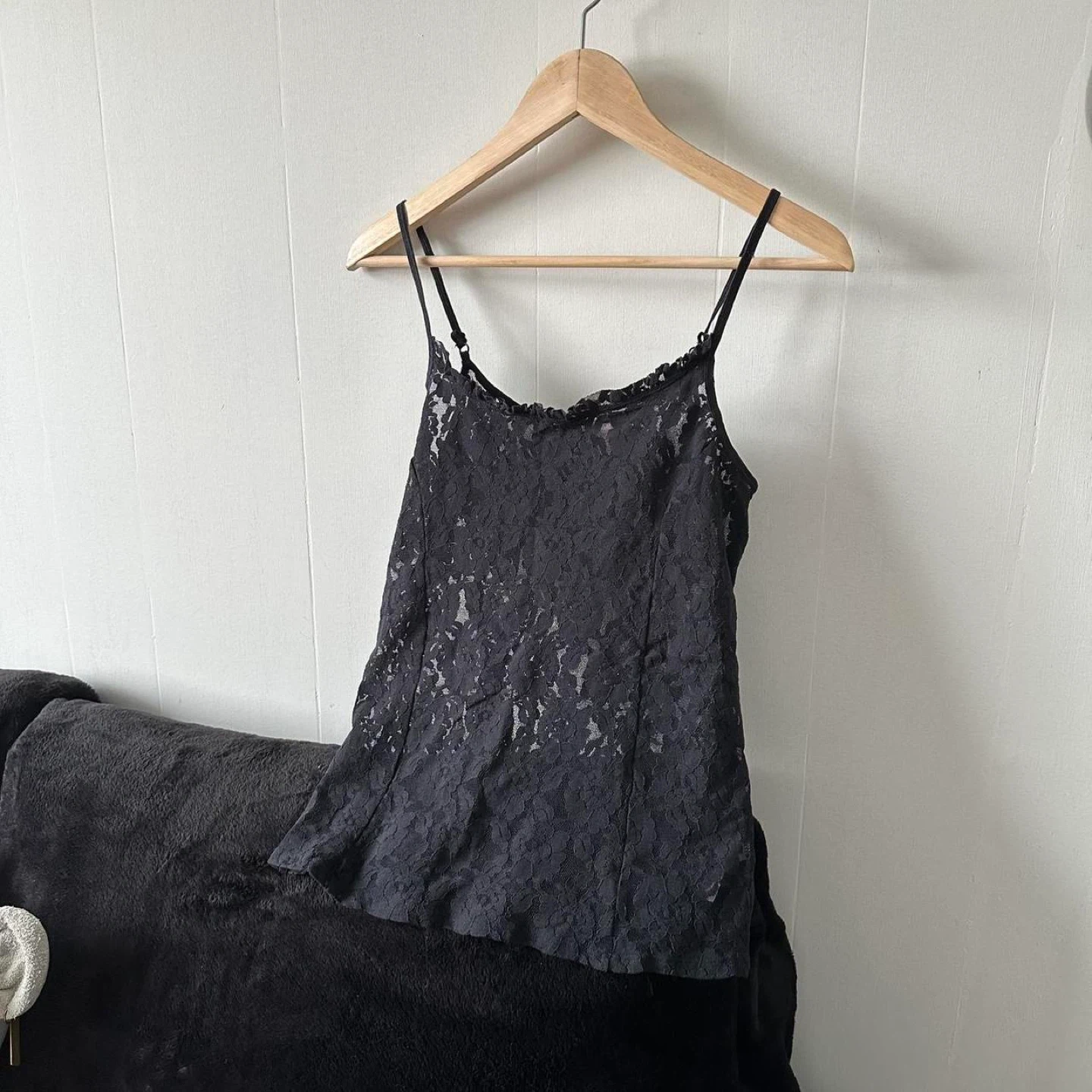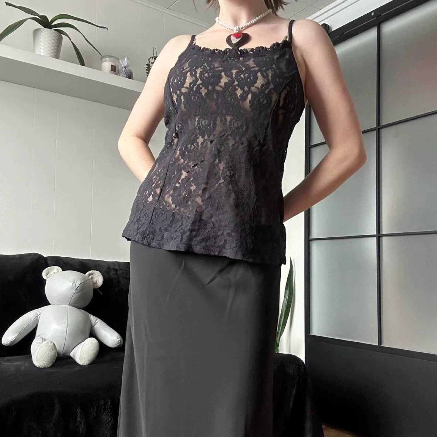 sheer lace, black camisole, delicate straps, floral lace, feminine top, evening wear, lingerie-inspired, lightweight fabric, elegant style, layering top