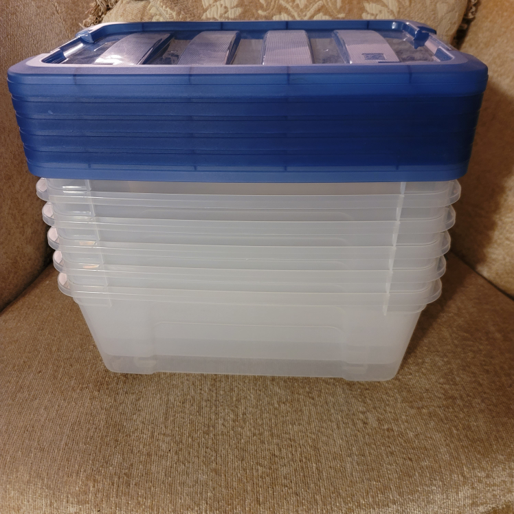 Selling a set of 6 Sterilite clear plastic storage bins with blue lids. These are great for organizing your home, garage, or office. They're in good condition and ready to use!