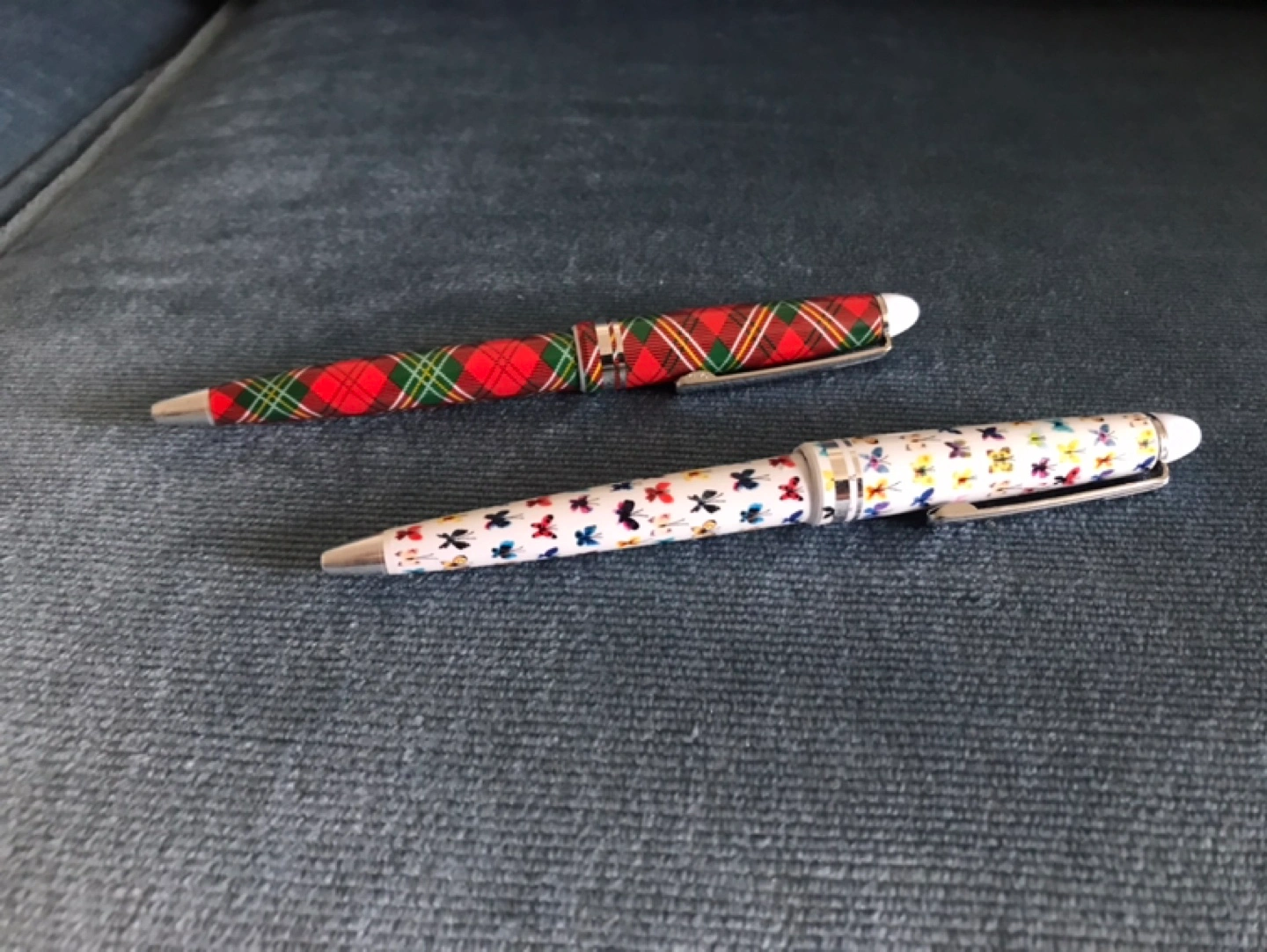 A pair of ballpoint pens with unique prints: One has a red & green plaid tartan print. Other has a colorful array of butterflies.