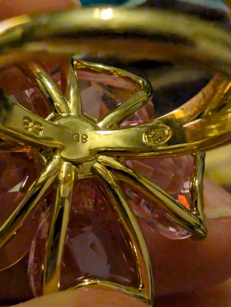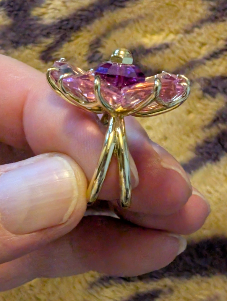 Swarovski Idillia cocktail ring.This is a beautiful flower-shaped ring with pink and purple crystals. The band is gold- tone plated, zirconia It's new no box and tags and would make a lovely addition to your jewelry collection.Ring is mark with stamps of Swans and 8D - 58 number is mean size of ring and authenticity.