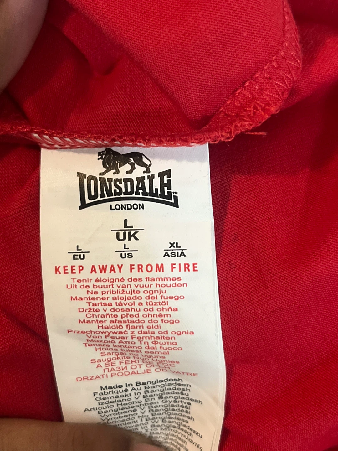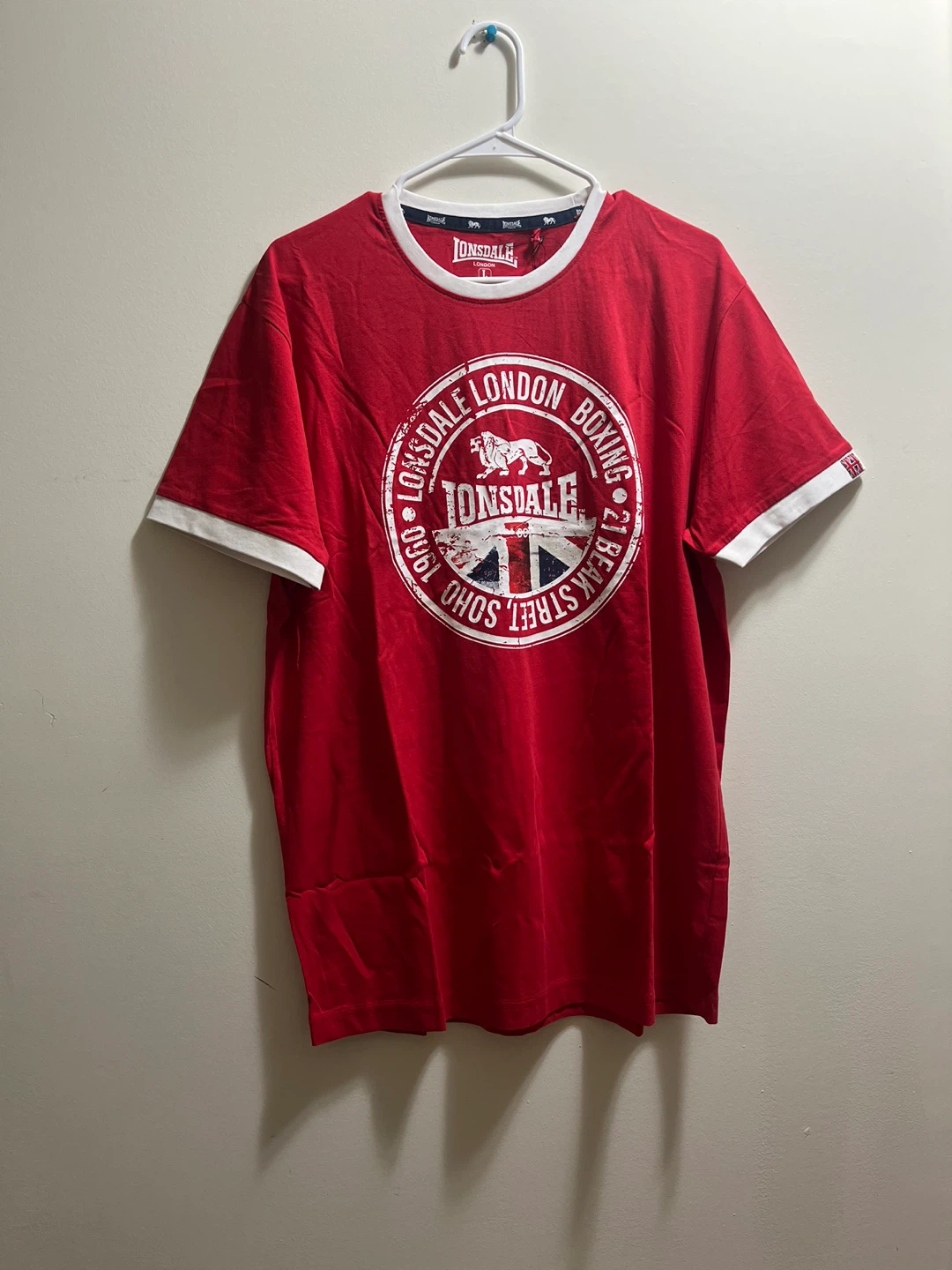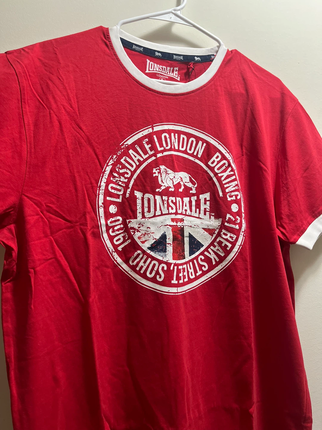Red Lonsdale t-shirt with a bold graphic design. Features white accents. Has a flag on the edge of sleeve as shown.
