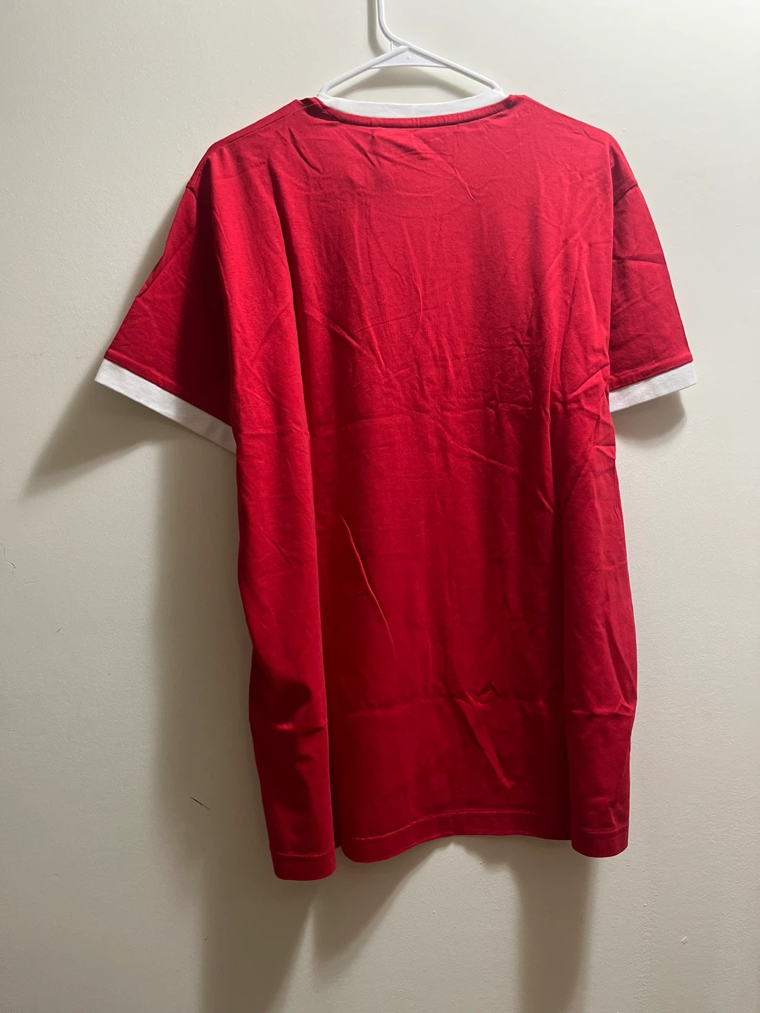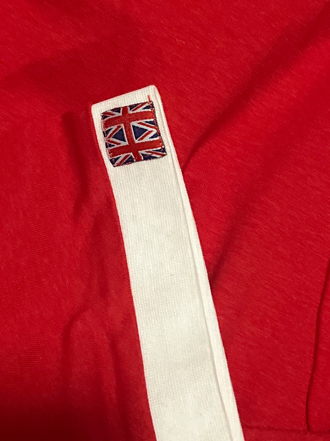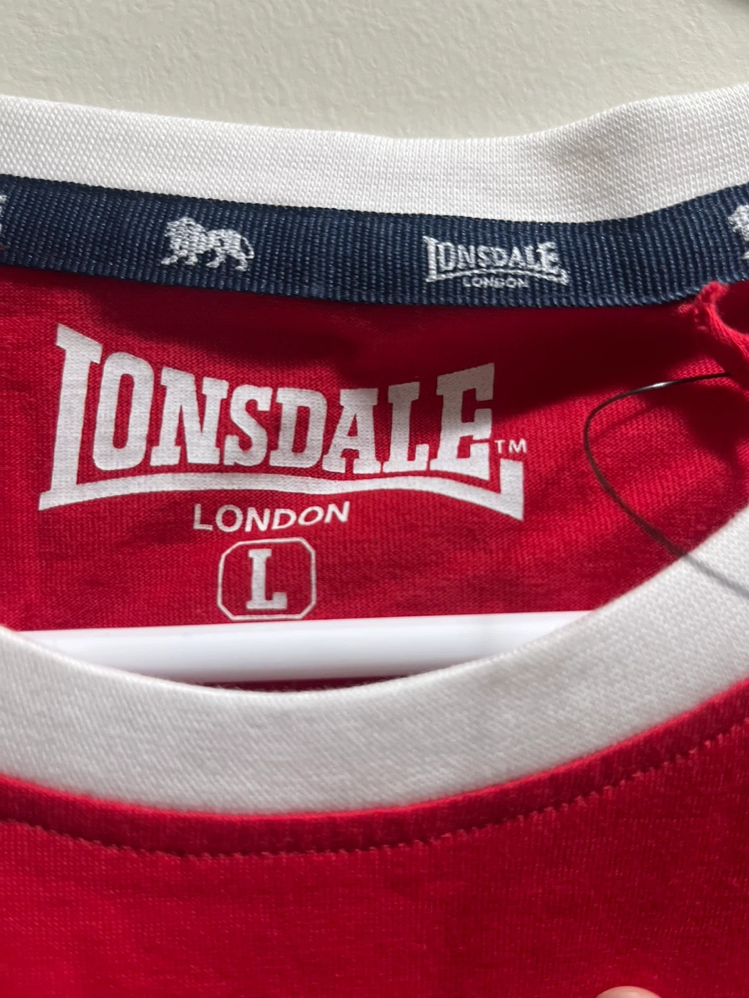 Red Lonsdale t-shirt with a bold graphic design. Features white accents. Has a flag on the edge of sleeve as shown.