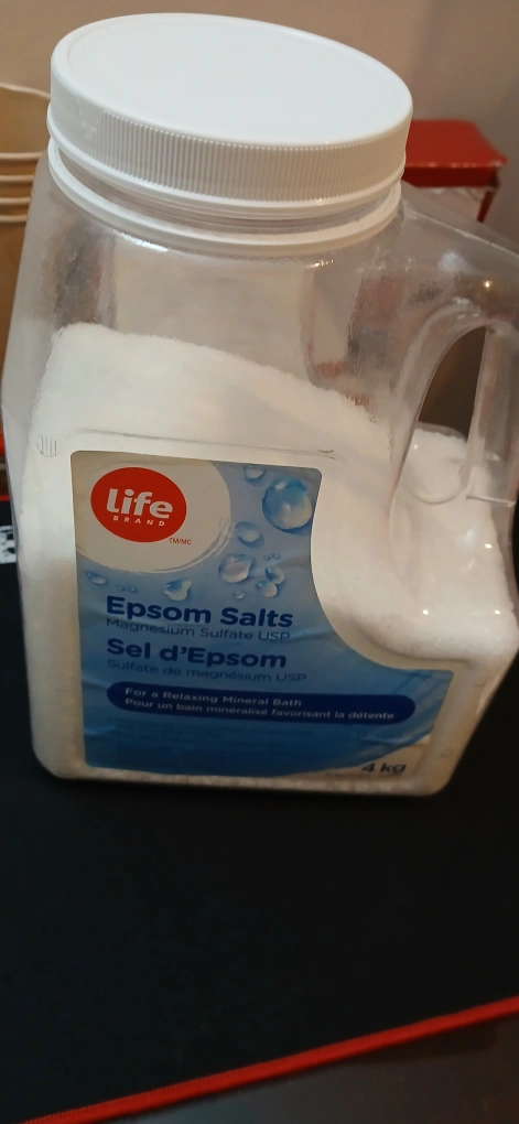 Selling a 4 kg container of Life Brand Epsom Salts. These are great for relaxing mineral baths! For external use only. Keep out of reach of children