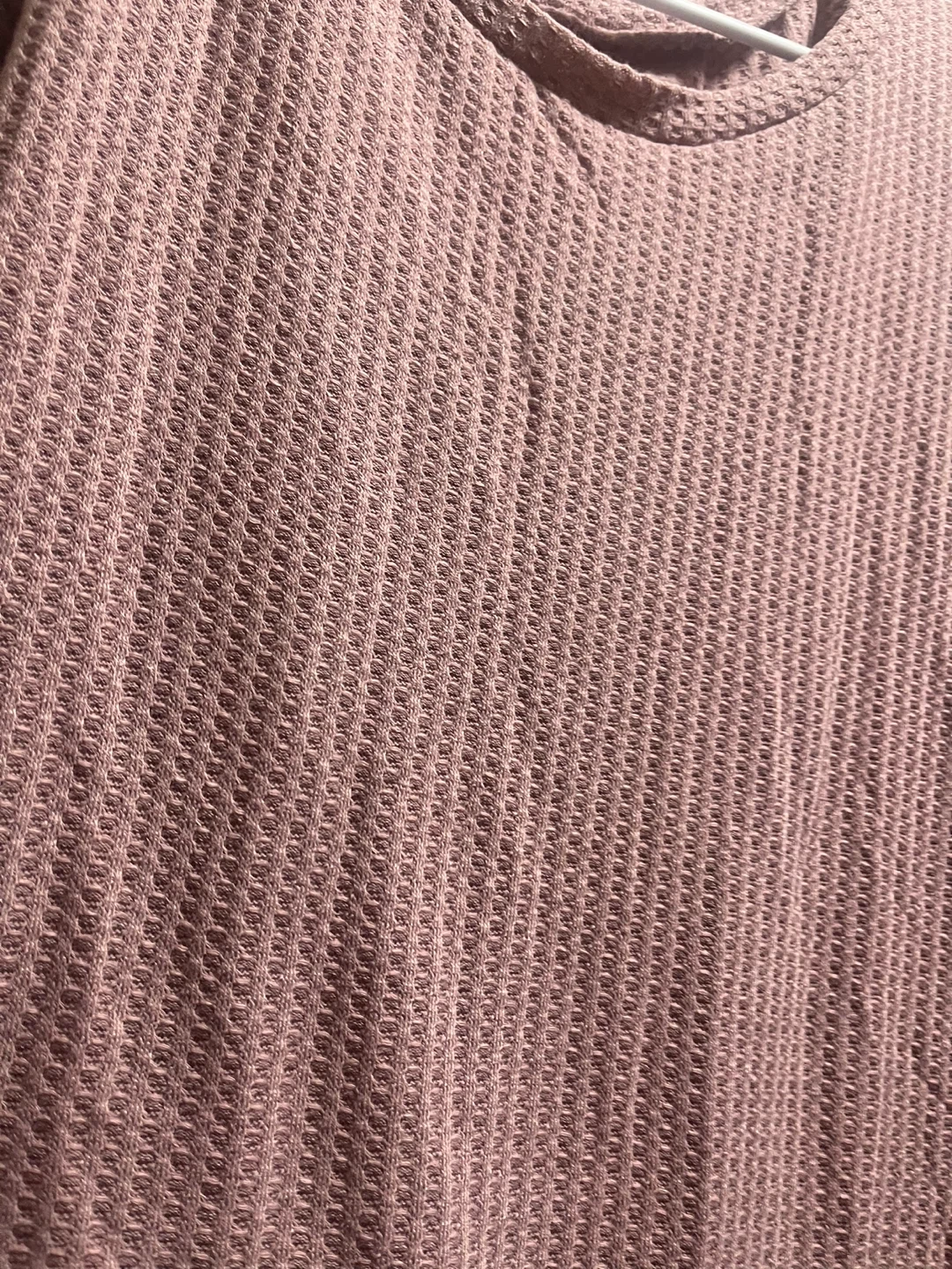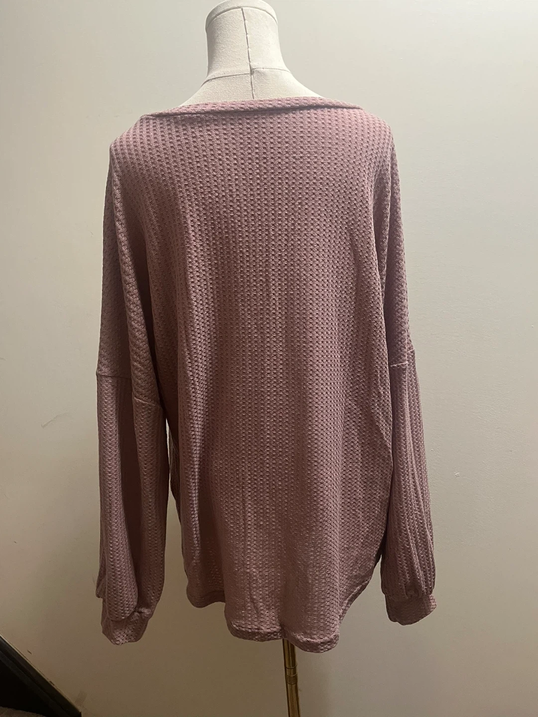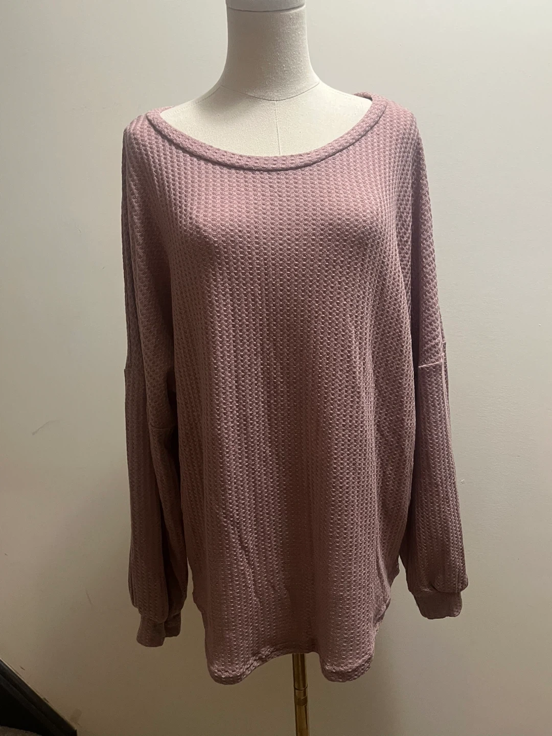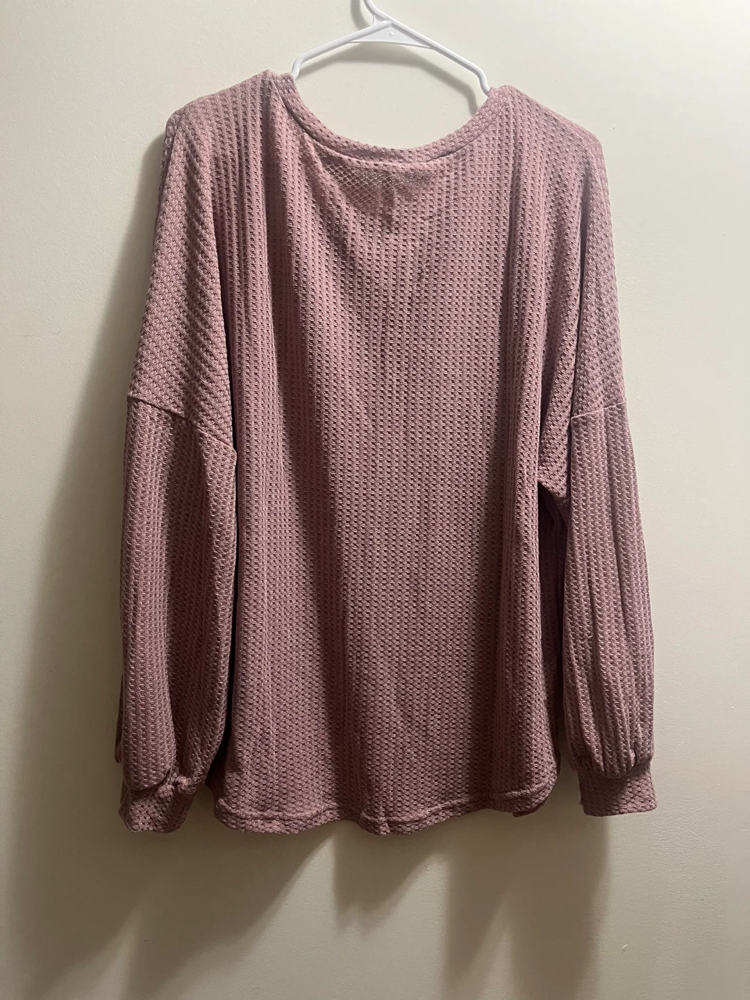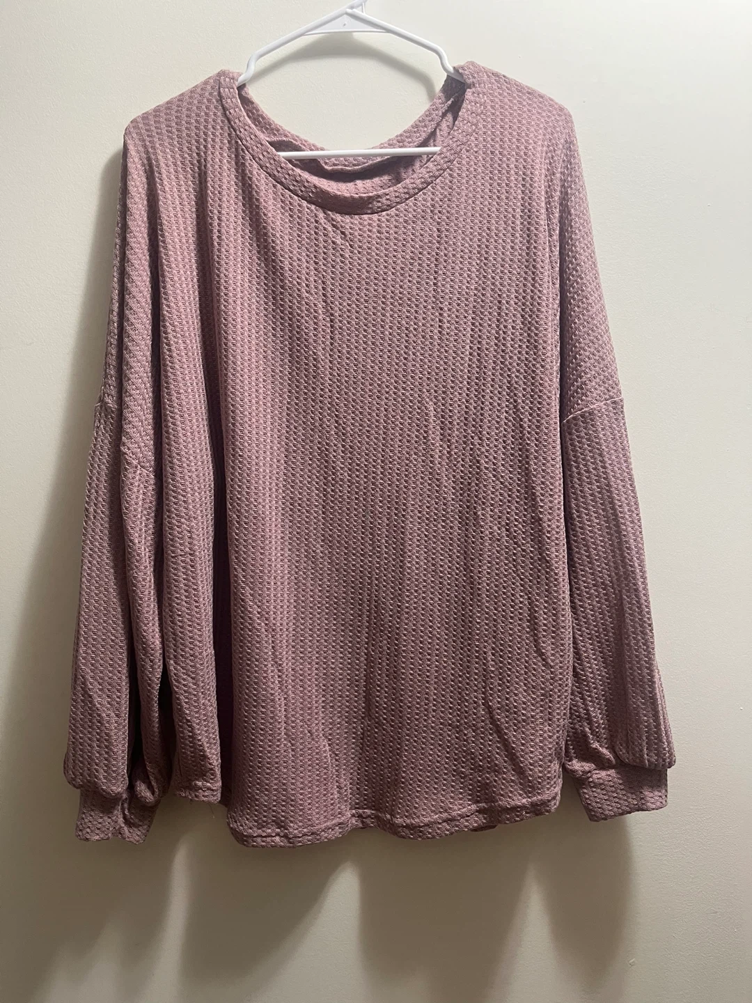 Selling a comfy pink waffle knit long sleeve top! It's in great condition and perfect for layering or wearing on its own. The material is soft and cozy, making it ideal for cooler weather. Cozy pink waffle knit sweater with long dolman style balloon sleeves. Brand new without tags Pickup Brampton or downtown Toronto Can’t find the sizing tag Approximate measurements: PTP 27” Length from shoulder to hem 30” *meant to be oversized