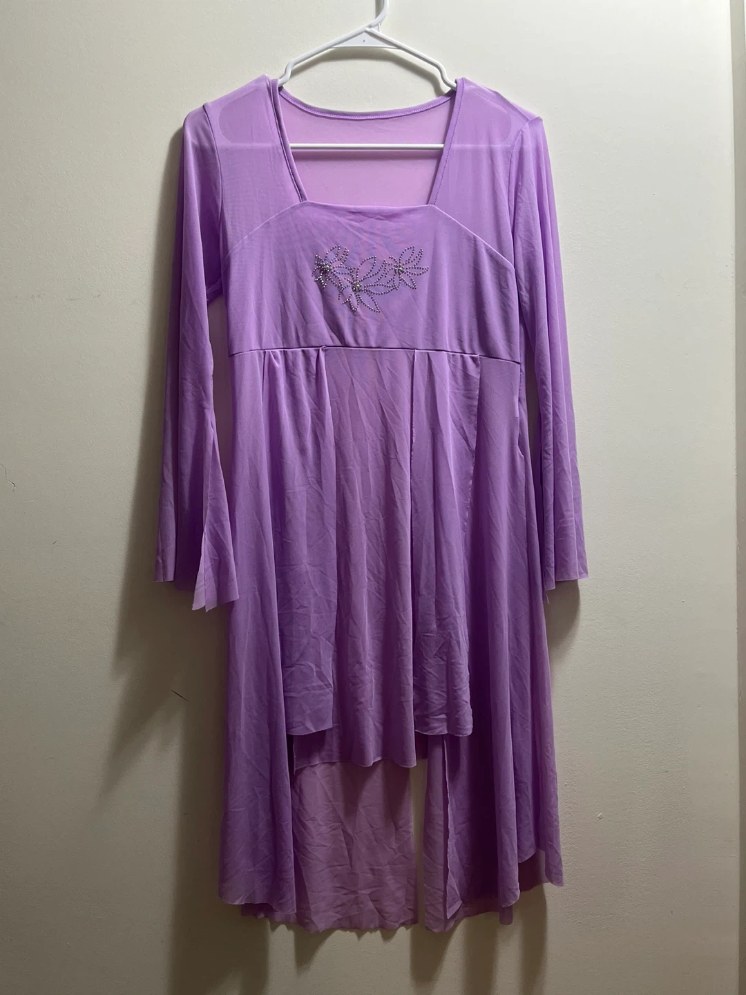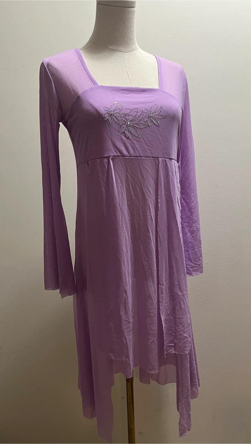 Elegant sheer lavender dress with long sleeves and floral stone design. Perfect for a stylish look.