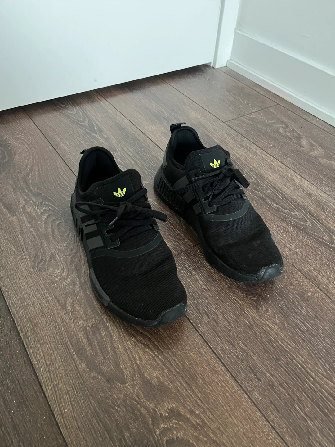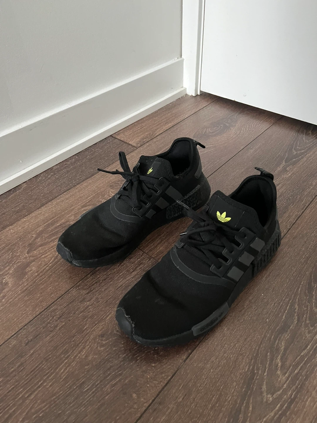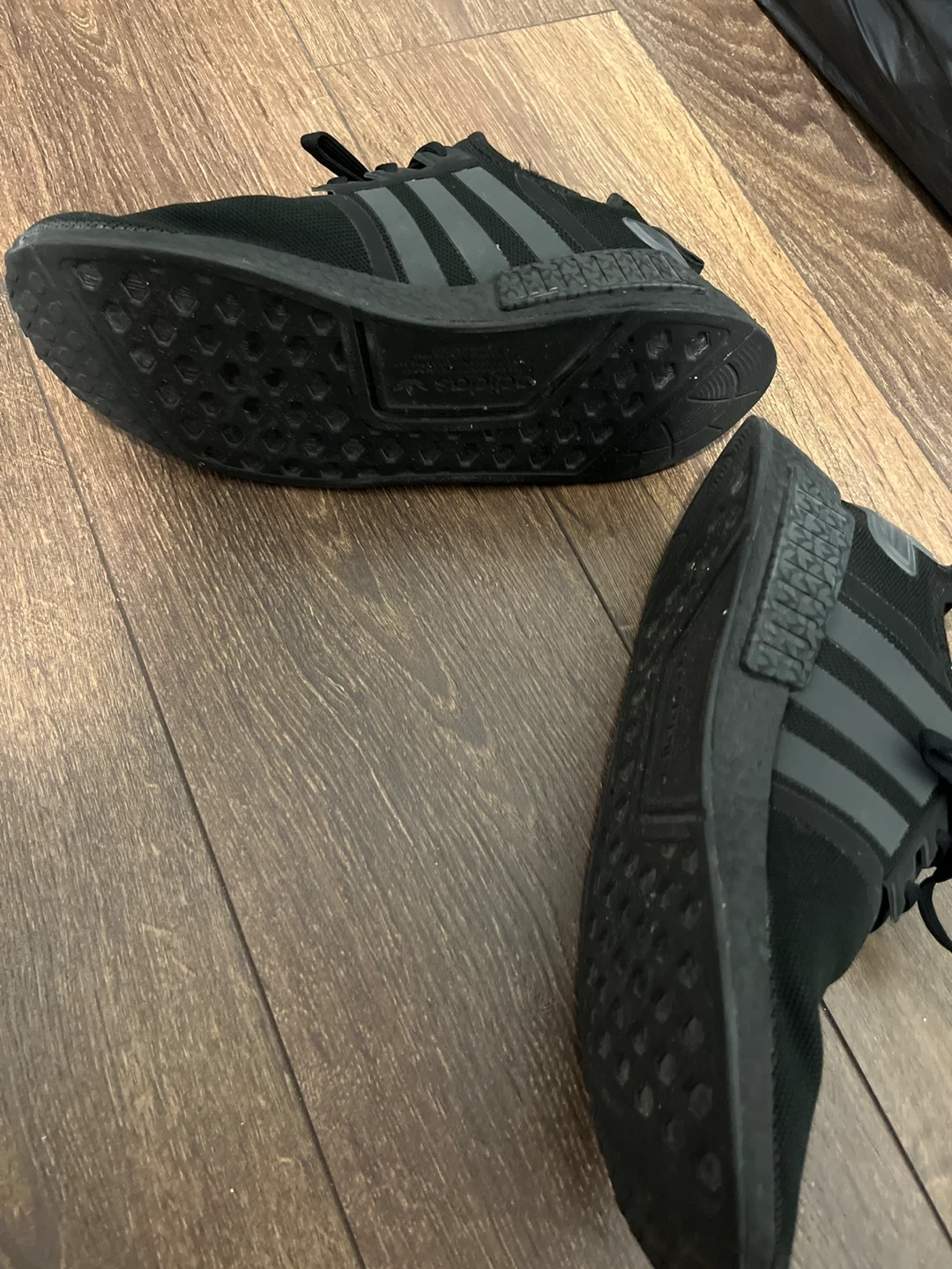 Selling a pair of Adidas NMD R1 sneakers in black. These are in very good condition and ready for a new owner. They feature the classic Adidas three-stripe design and a very comfortable fit. Perfect for everyday wear!