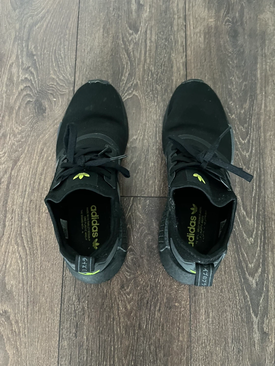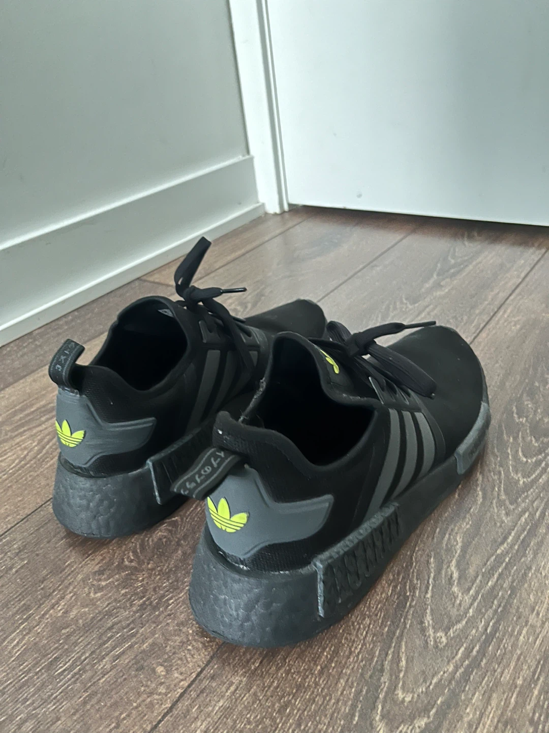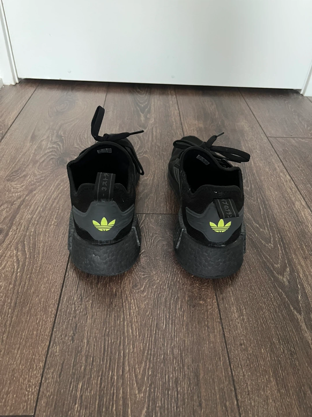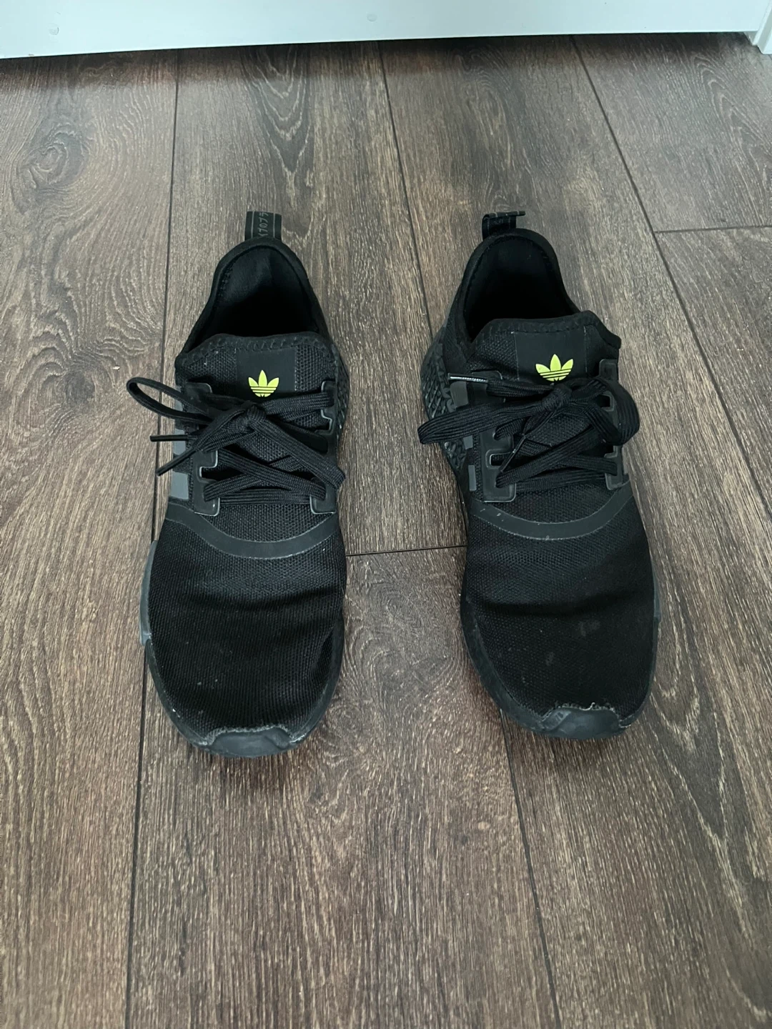 Selling a pair of Adidas NMD R1 sneakers in black. These are in very good condition and ready for a new owner. They feature the classic Adidas three-stripe design and a very comfortable fit. Perfect for everyday wear!