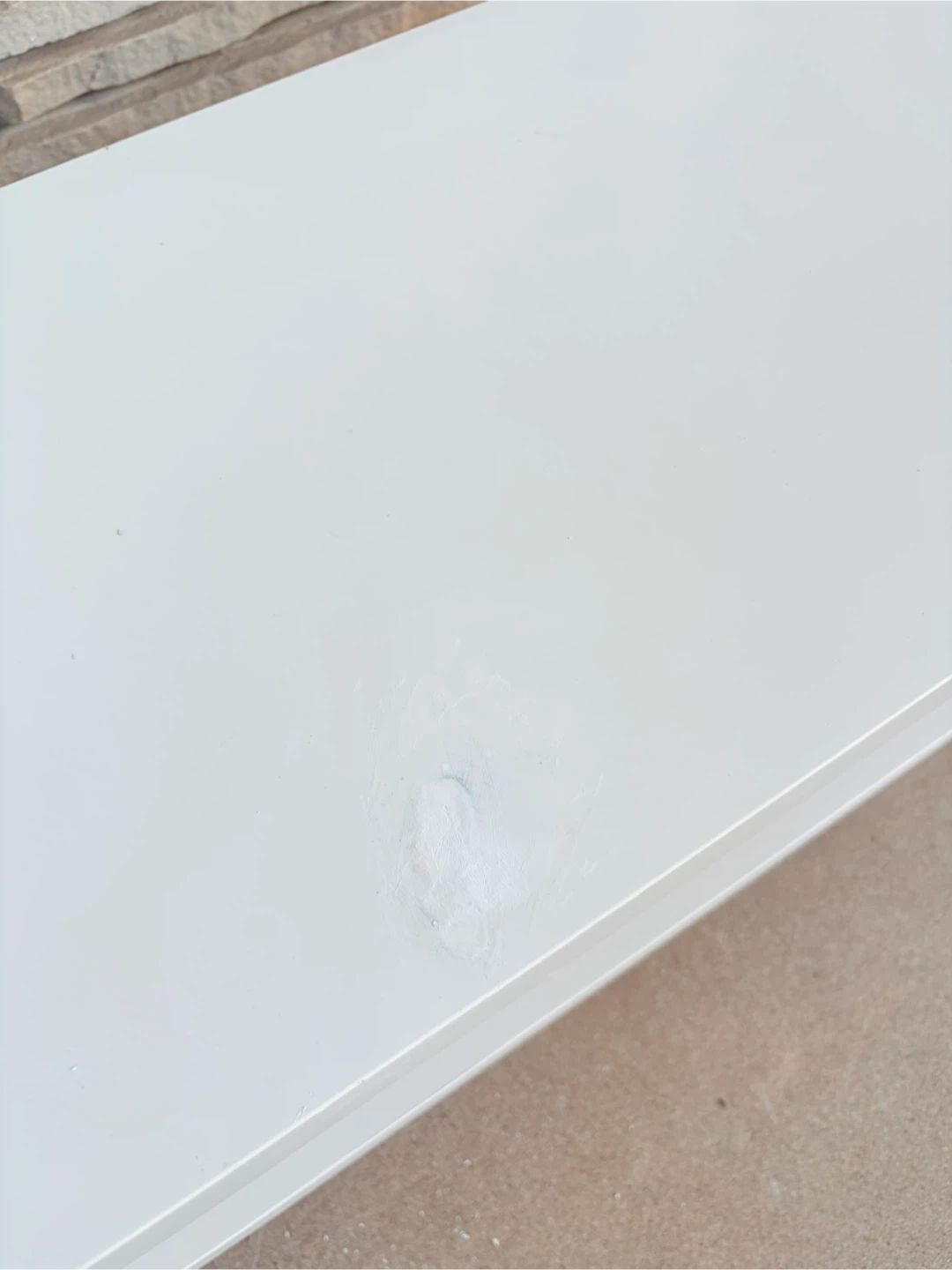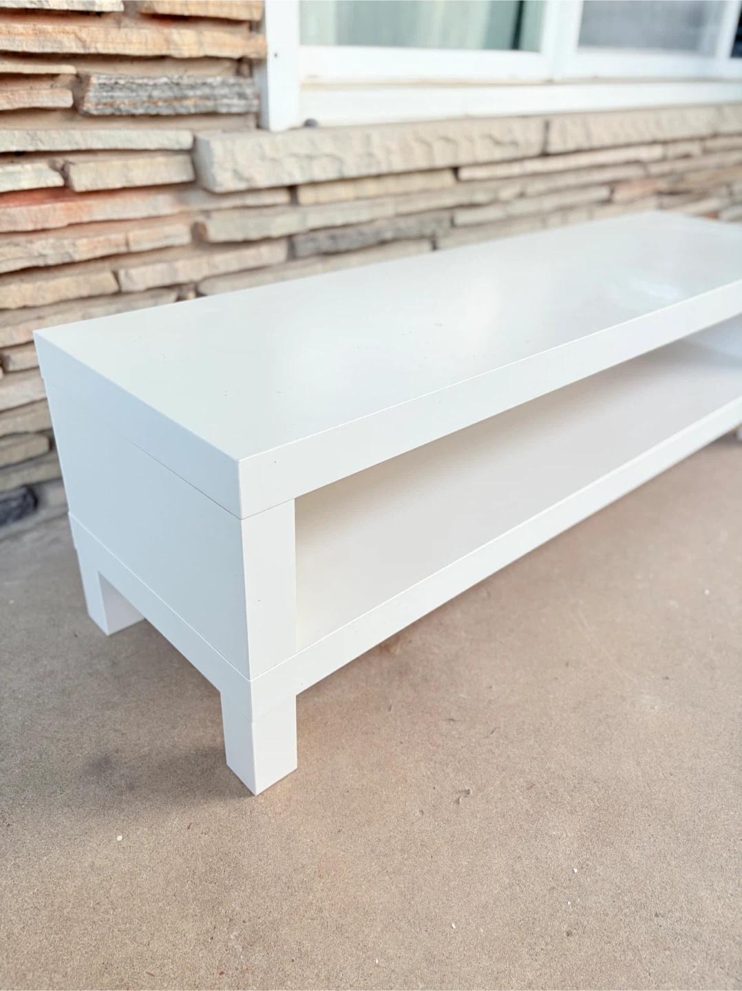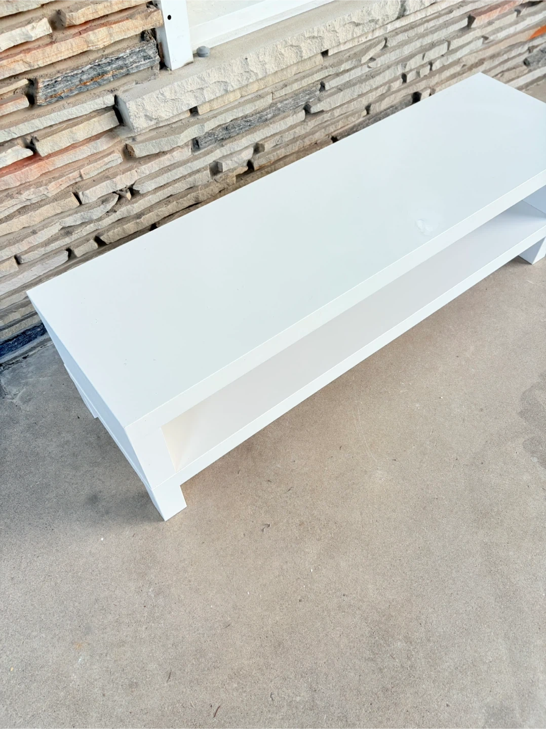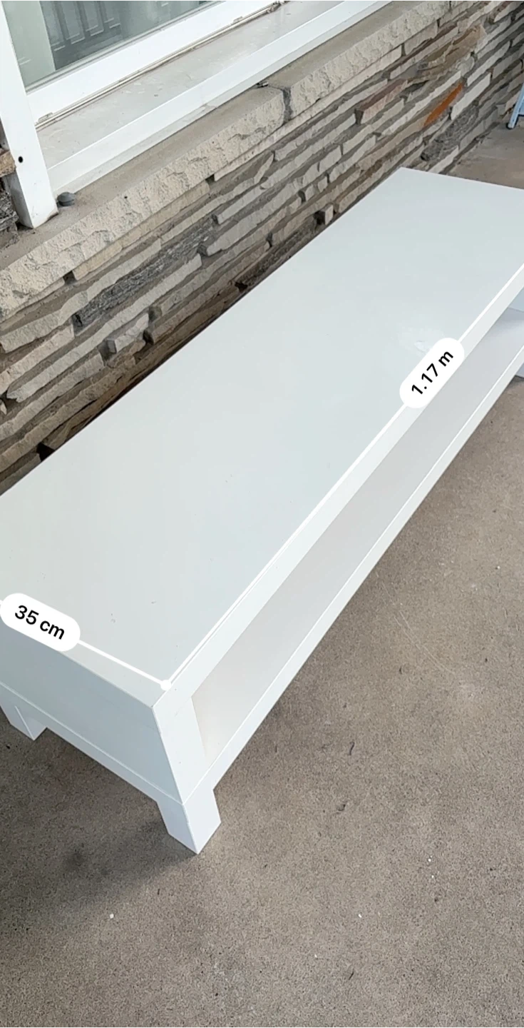Selling a white TV stand or bench. It's in good condition and measures 1.17 meters in length and 35 cm in width. There is a small blemish on the surface.