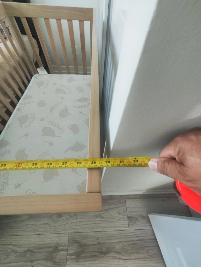 Selling a gently used wooden baby crib. It's in good condition and comes with a mattress. The crib measures approximately 32 inches in width and 57 inches in length, making it a cozy and safe sleeping space for your little one