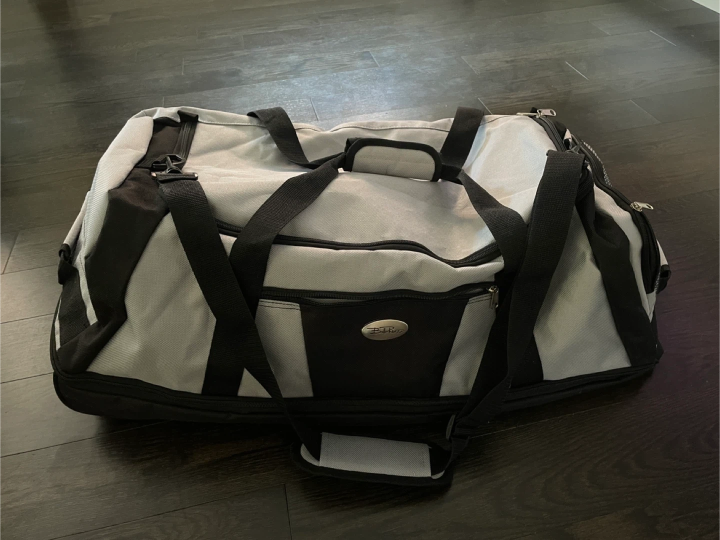 Brand new duffel bag with wheels ready for your next trip to the gym or a weekend getaway. The silver and black colour scheme is sharp and modern, and it's super practical for carrying all your essentials