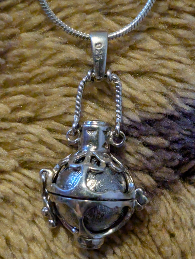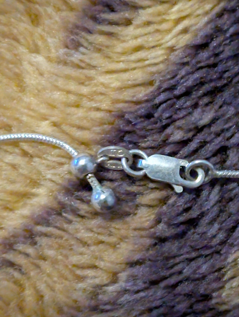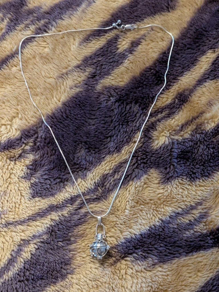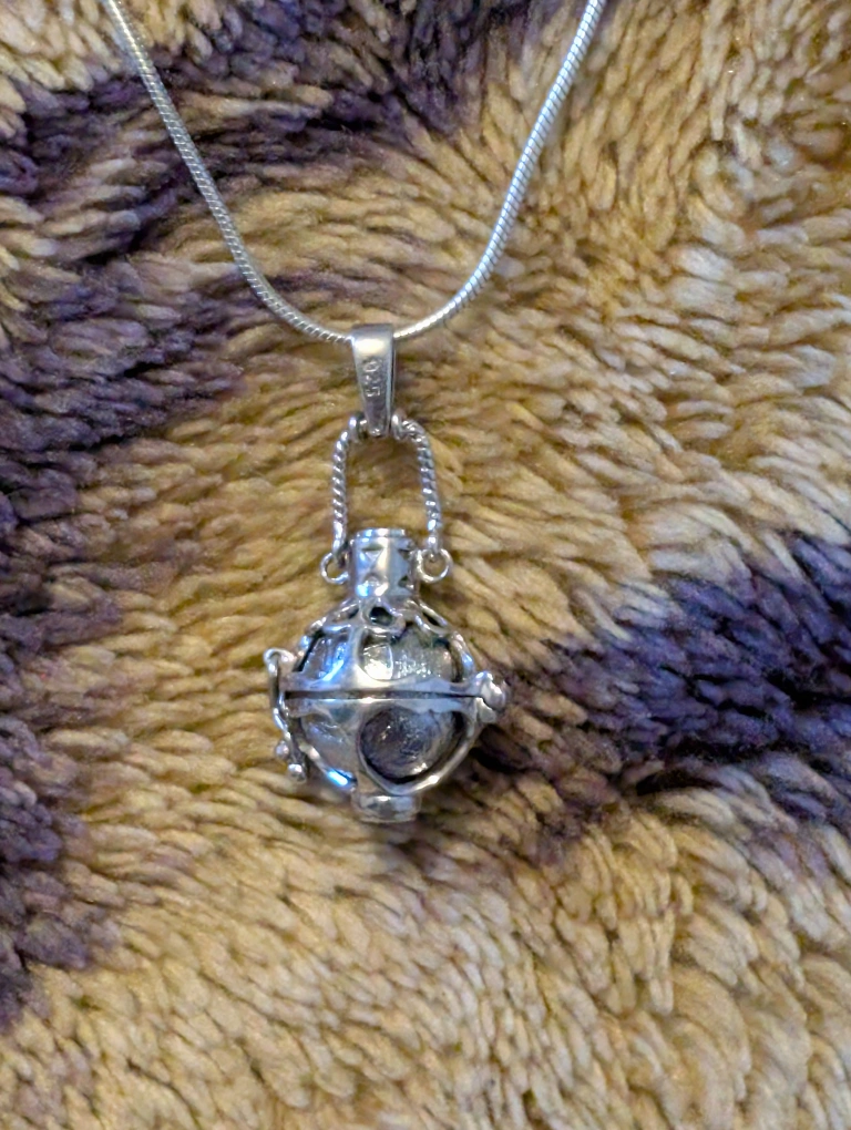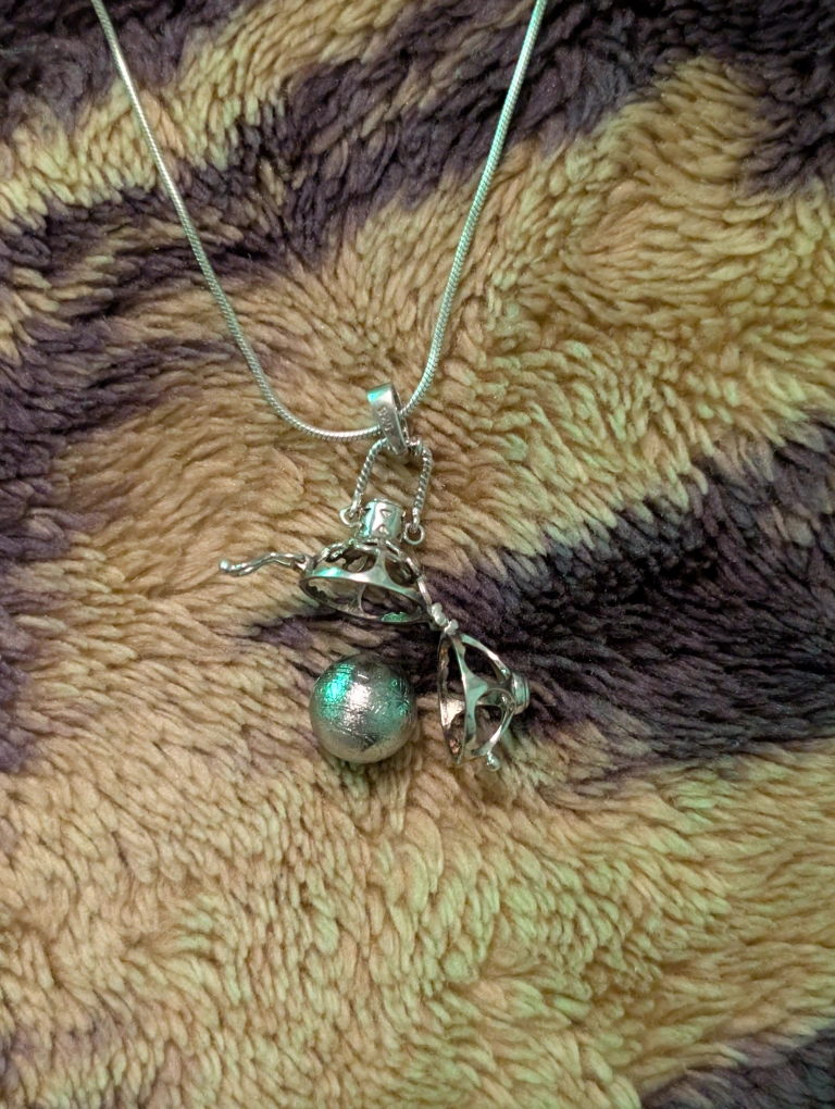 This is a lovely silver necklace featuring a unique locket pendant. The pendant Munionalusta Meteorite removable shpere lacket moldavite cage has an intricate design and opens up. The chain is 4 - safe Snake chain also silver and complements the pendant nicely bot mark 925 silver and weight 16.36 grams and the chain is long 20" inch.