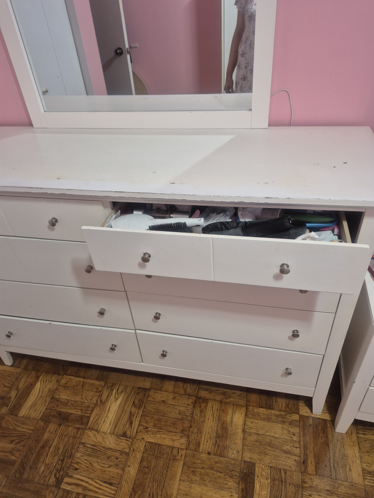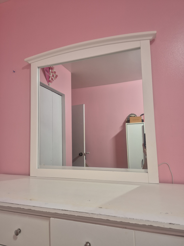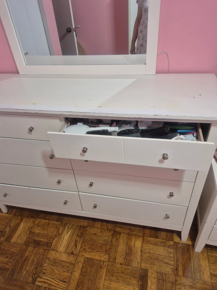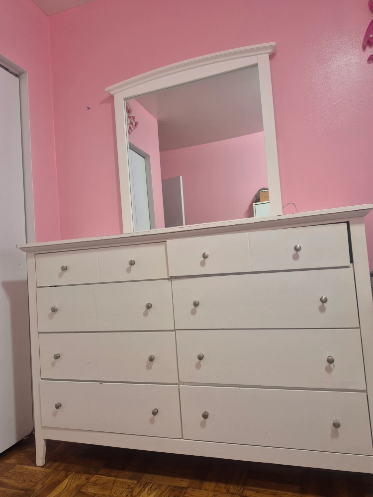 Selling a white dresser with an attached mirror. It has 8 drawers, perfect for lots of storage. There are some signs of use on the top surface, as shown in the pictures, but overall it's in good condition and ready for a new home