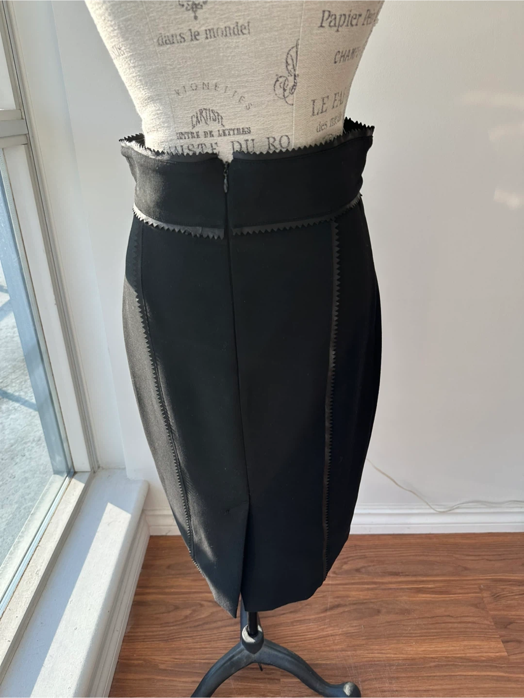This Burberry high waisted pencil skirt with leather detailing gives the perfect silhouette. Hitting just past the knee with a slit in the back, that is perfect for a feminine and professional look. This skirt would pair perfect with the matching suit blazer done in the same material.