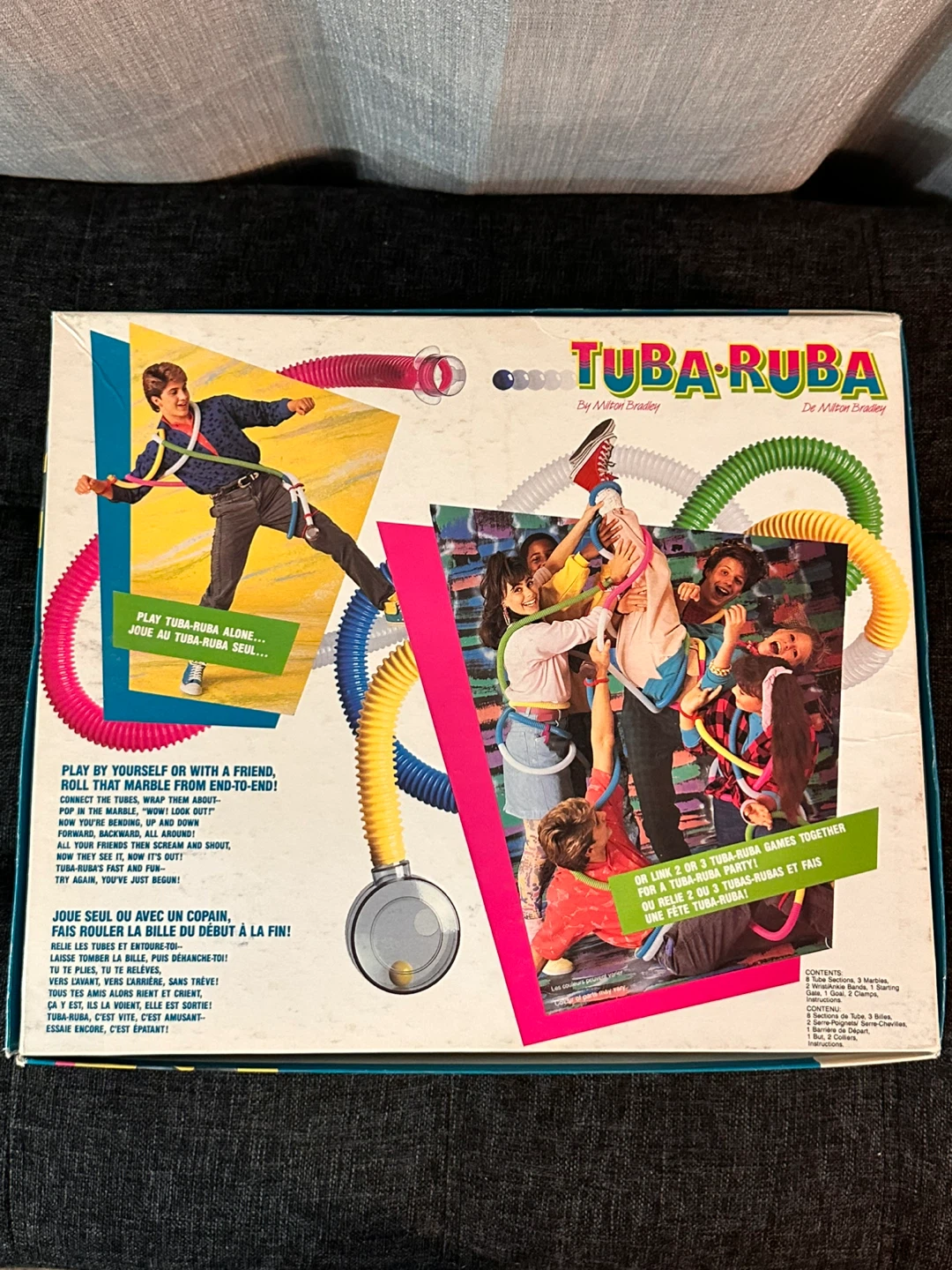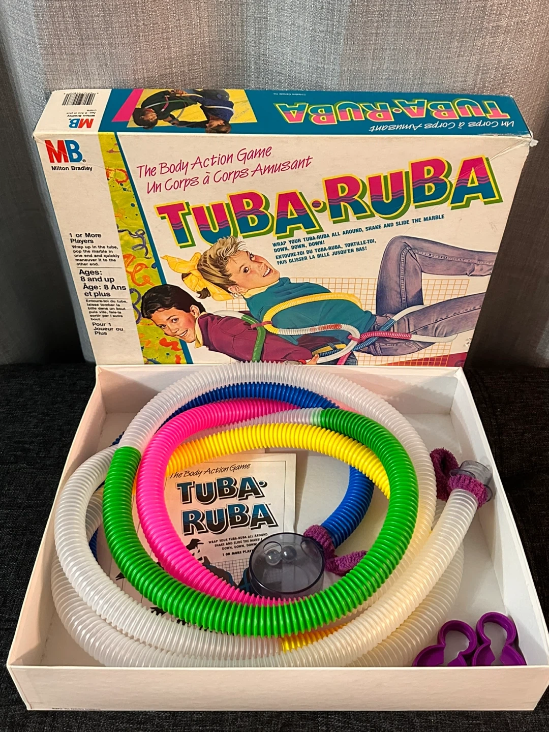 Original 1987 Tuba-Ruba is the body action game by Milton Bradley! This game is for 1 or more players, ages 8 and up. It comes with all the pieces, including the tubes, 2 marbles, and starting blocks. Get ready to wrap your Tuba-Ruba all around, shake and slide the marble down!
