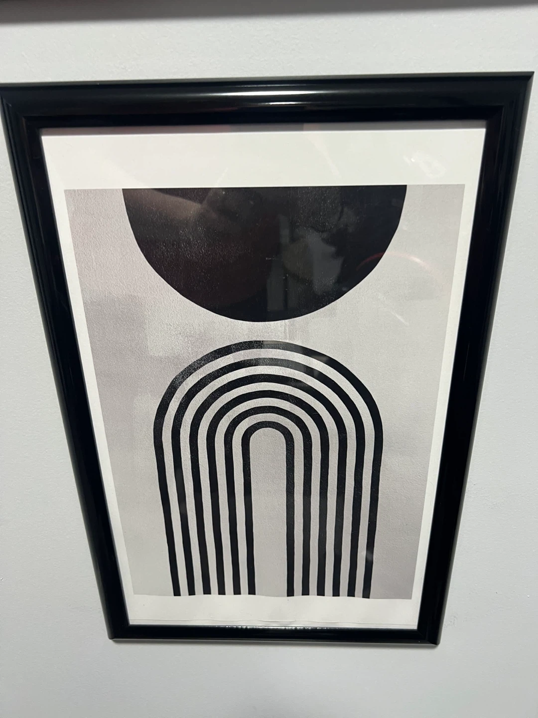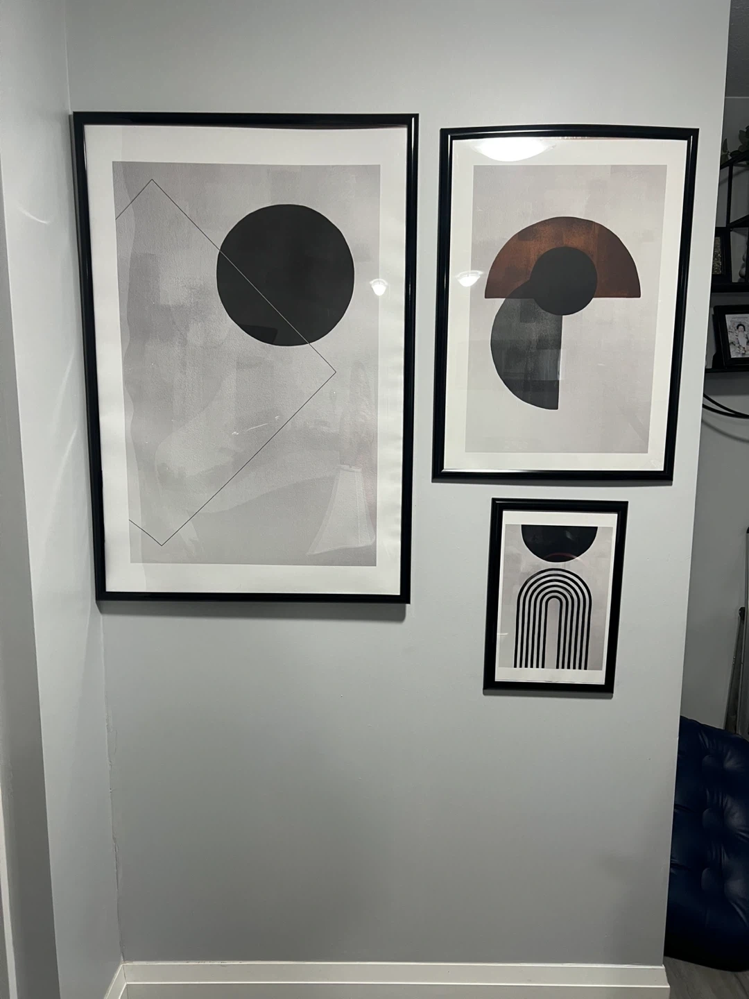 Selling a set of three framed abstract art prints! They're in great shape and would look lovely in any room of the house. The frames are black and the prints feature geometric designs.